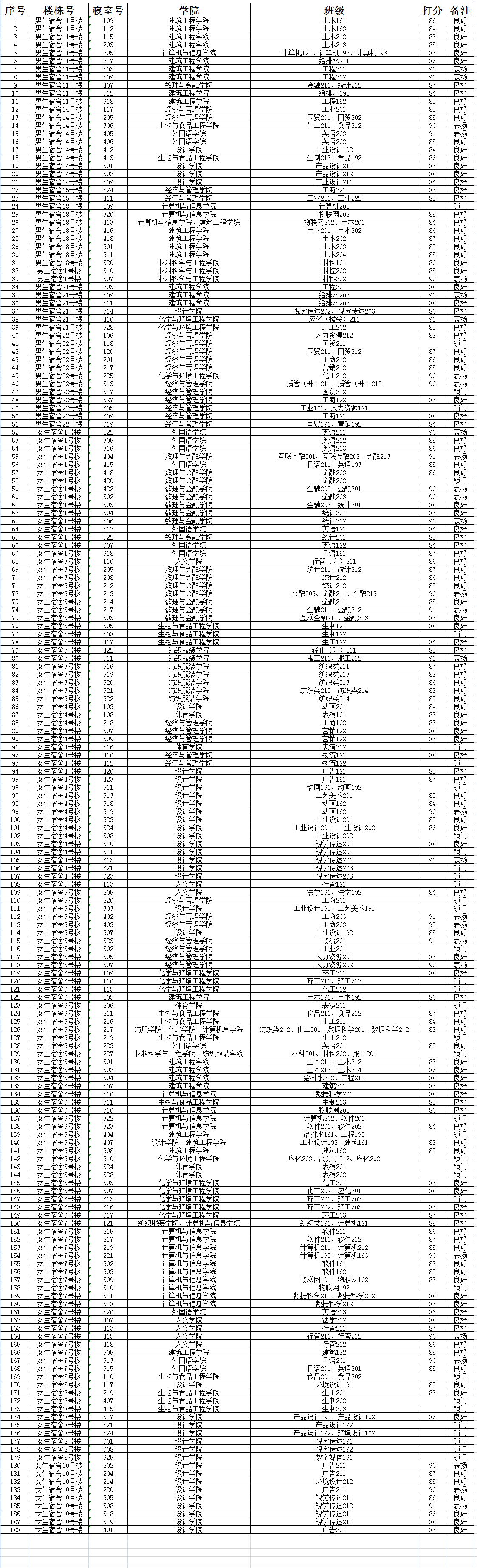2023年3月份主校区宿舍卫生检查成绩统计表