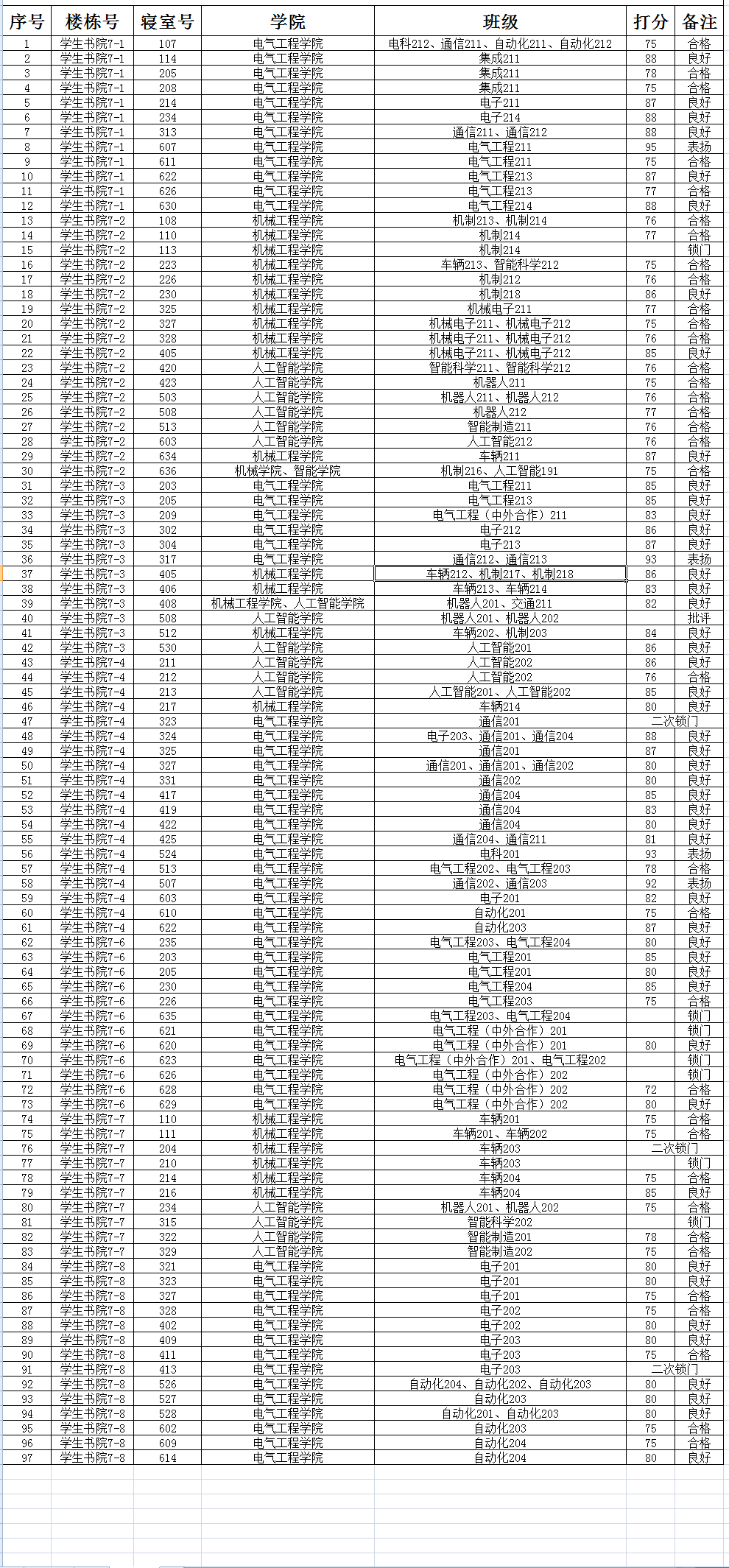 2023年6月份国际工程师校区宿舍卫生检查成绩统计表