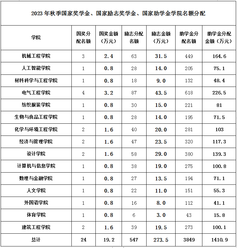 省财政厅、教育厅2023年分配我校国家奖学金名额为24人,每人8000元;国家励志奖学金名额为547人,每人5000元;国家助学金名额为3849人。各学院根据困难学生认定情况,严格按照分配的指标执行。助学金推荐人数等于核发总人数,指标金额等于核发金额。各学院可根据困难学生认定情况,分成每人4500元/年(特别困难)、3000元/年(困难)、2000元/年(一般困难)三个资助等级。其中,退役士兵学生全部享受退役士兵单列专项国家助学金,不参加国家助学金评选,可参评国家奖学金、国家励志奖学金。