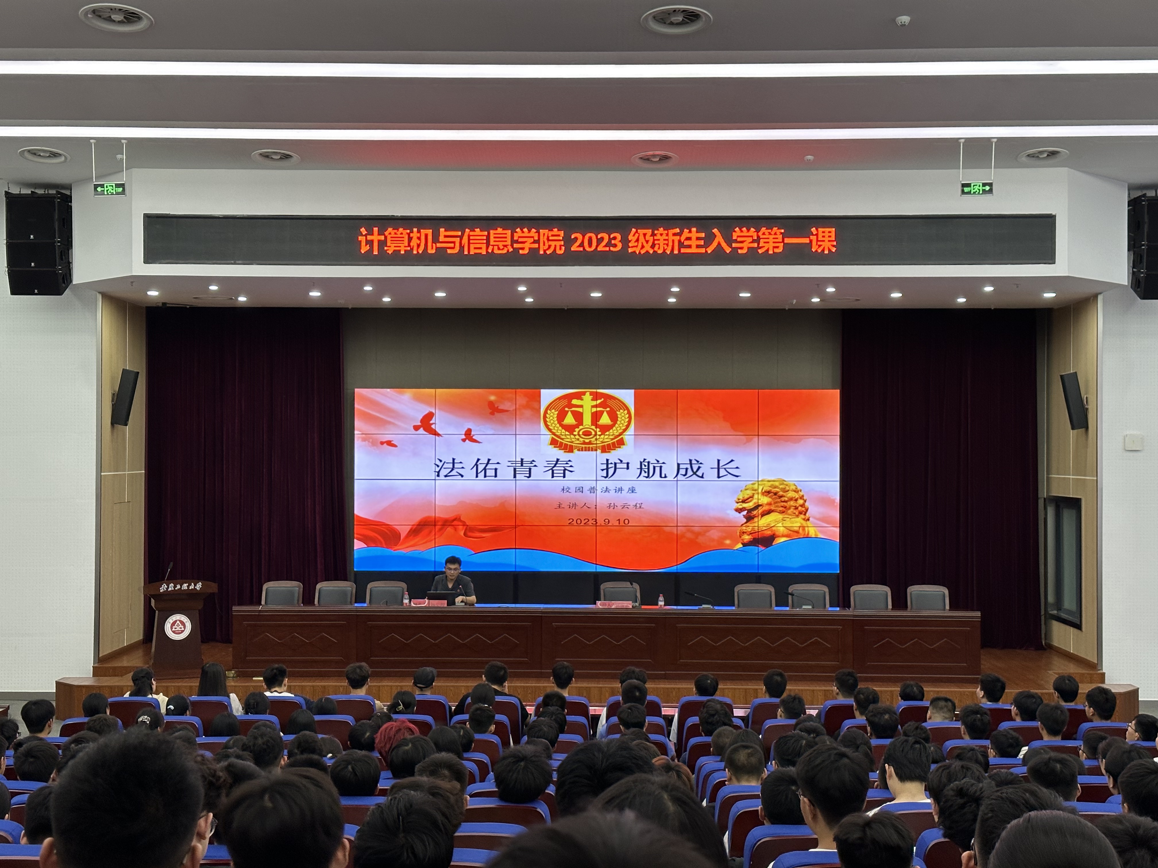 为上好新生入学教育的“第一课”,实现新生角色的快速转变,提升新生思想理论水平、校园法治文化、网络文明素养等,引导学生树立正确的世界观、人生观、价值观,提高综合素质,9月10日,计算机与信息学院2023级新生入校后就体验了一堂“‘E’路同行 青春筑梦”为主题的开学第一课。特别邀请鸠江区法院民二庭庭长孙云程为新生开展防诈骗专题报告。院党委书记李卫东、副书记孙德茹分别围绕入党启蒙教育和新生适应性教育进行讲解。团委书记、新生辅导员和全体2023级新生参加。