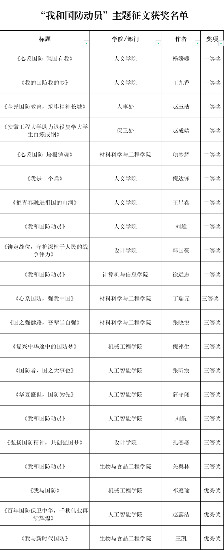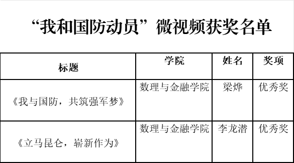 为深入学习宣传贯彻党的二十大精神,推动学习贯彻习近平新时代中国特色社会主义思想主题教育走深走实,扎实推进全民国防教育和国防动员事业高质量发展,根据《关于举办“我和国防动员”主题征文和微视频校内选拔赛的通知》,经过学生提交作品,评委评审,确定杨媛媛等23名同学和教职工获得“我和国防动员”主题征文和微视频比赛奖项,现予以公布。