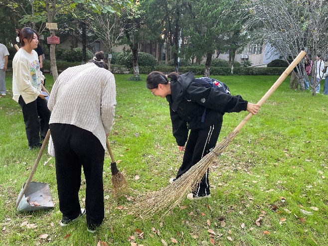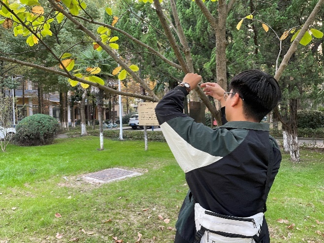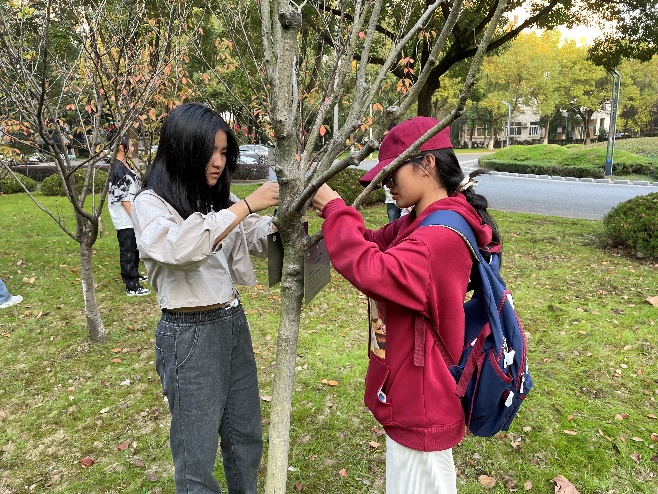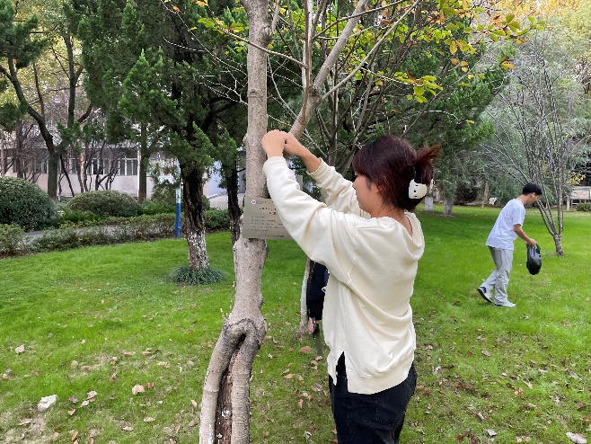 活动开始,辅导员余丹丹介绍了此次活动的具体内容和重要意义,要求同学们牢固树立“绿水青山就是金山银山”理念,增强生态文明意识、劳动意识、爱校意识,定期做好树木的维护和地面清理工作。随后,在大二学长学姐的带领下,新一批树木认养的同学将自己的银色铭牌挂在认养的树木上,并对周围垃圾和杂草进行清理。