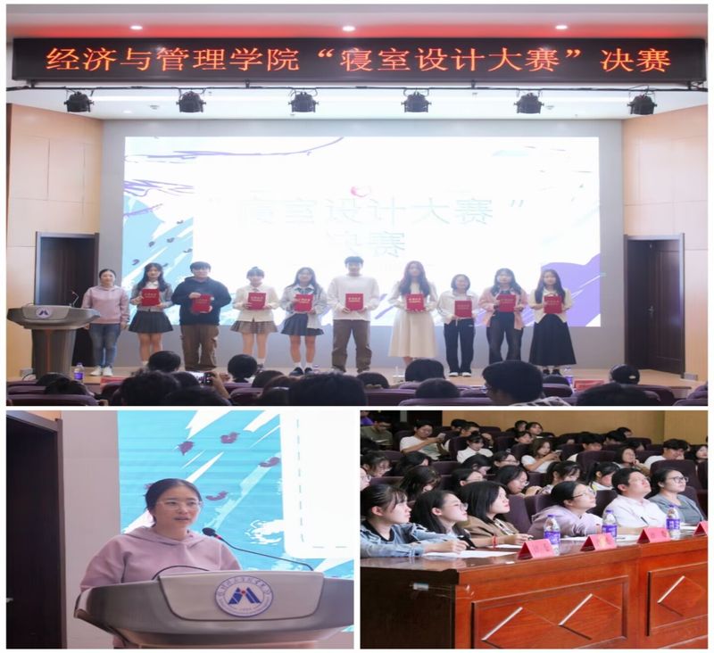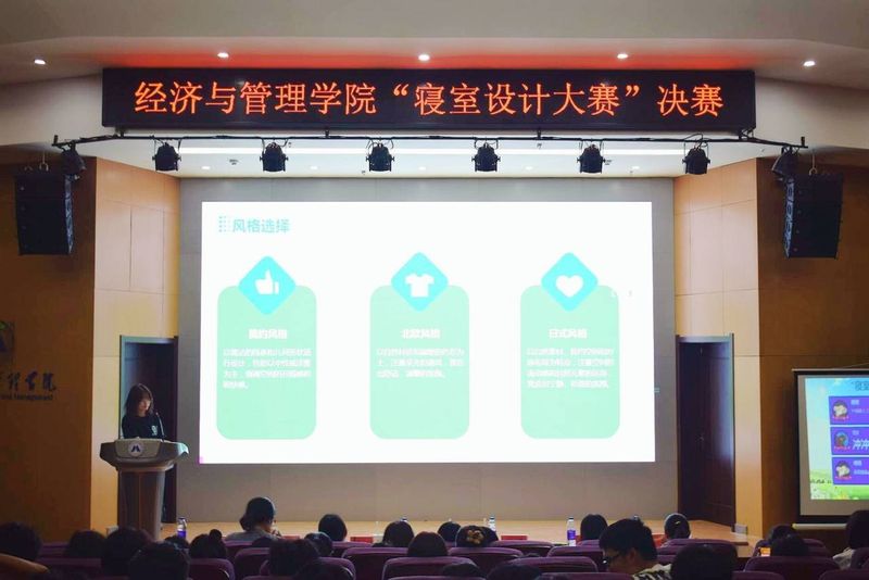 为促进寝室和谐,积极建设校内寝室文化,全面践行“和”起来、“勤”起来的育人实践要求,建设良好寝室关系,经济与管理学院于2023年11月3日晚在C座7楼报告厅举办“寝室设计大赛”决赛,本次比赛特邀学生处秘书赵静云、校团委宣传科科长孙琳瑶、学生处创业科副科长王鸣鹃和国贸212陶睿敏、工商211李丁丁同学担任评委。院党委副书记刘海涛、团委书记赵恒梅以及学生代表共计200余人观看了此次比赛。