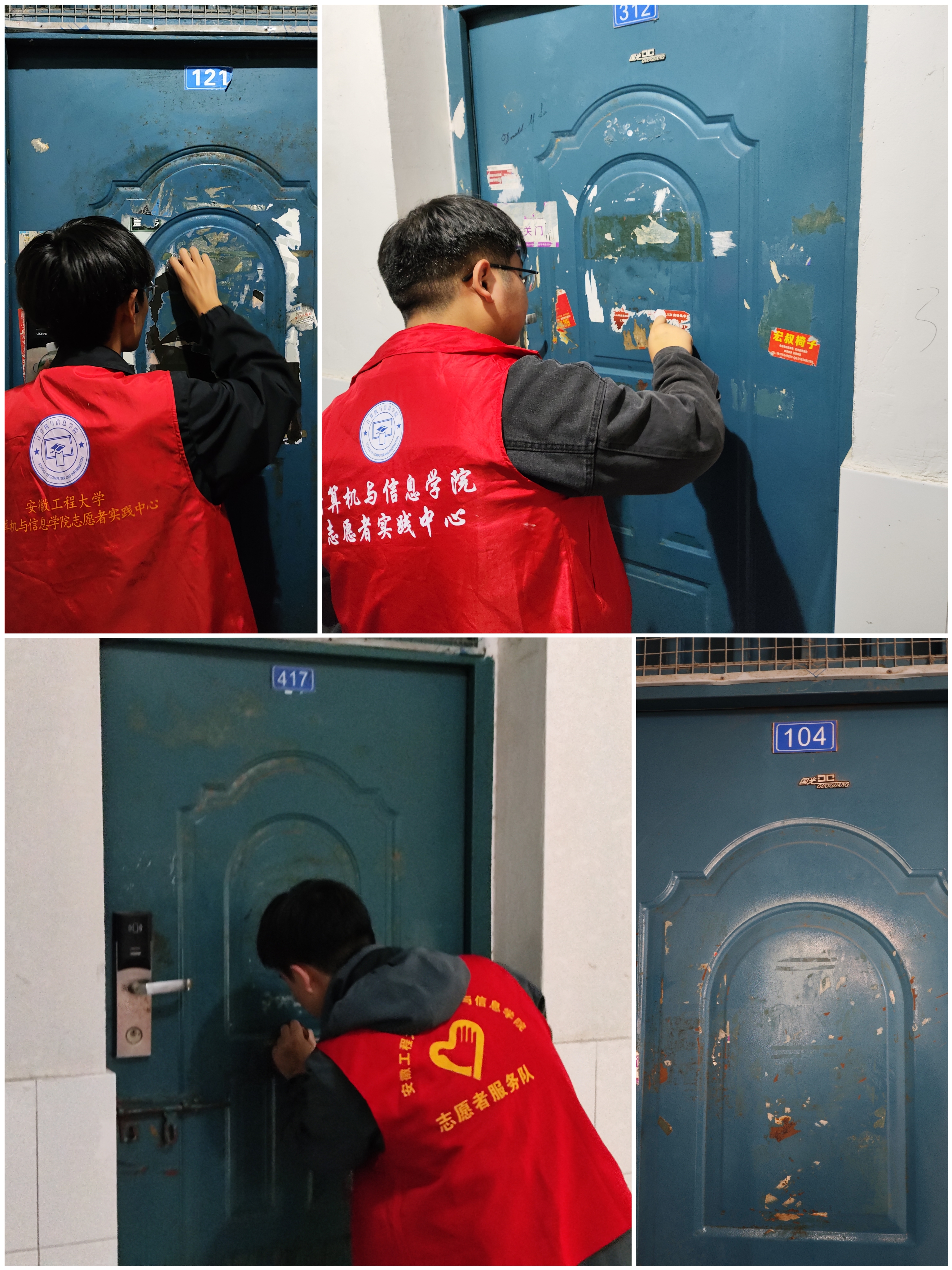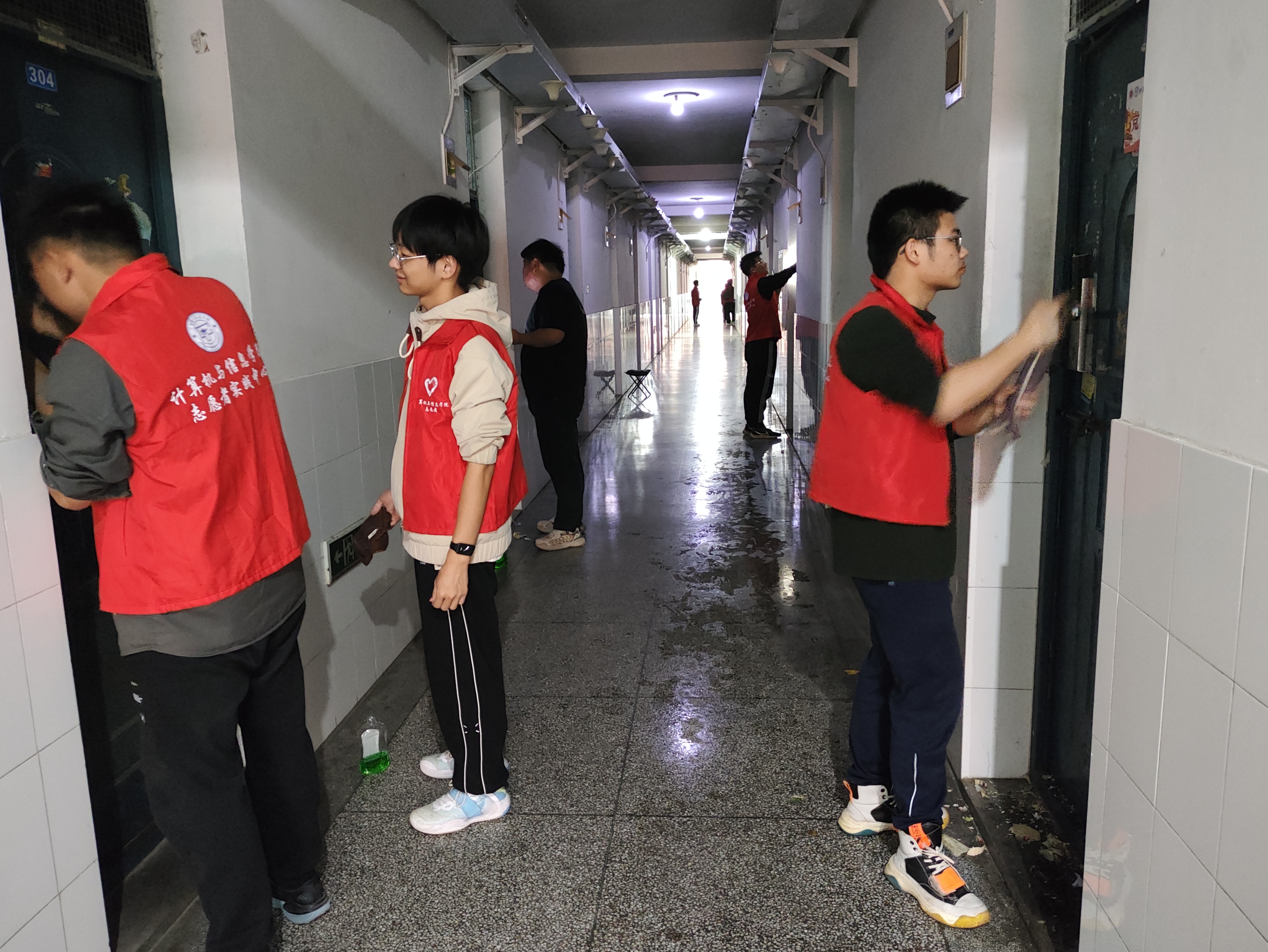 一个个忙碌的红马甲,绘就了一道亮丽的风景线。志愿者们有序分工、互相配合,用清洁剂等工具对每层楼的寝室门进行了全面清理。大家充分发挥志愿服务精神,不怕脏不怕累,面对小广告粘贴牢固、治理难度大等问题,同学们出主意、想办法,利用钢丝球和抹布,不放过每个角落。我们的行动也吸引了其他同学的关注和参与,大家纷纷主动加入到清理队伍中来,经过不懈的努力,终于还原了寝室门的原貌。在集中清理寝室门的“牛皮癣”同时,志愿者们还对同学们进行宣传教育,号召大家为维护寝室环境贡献一份自己的力量。