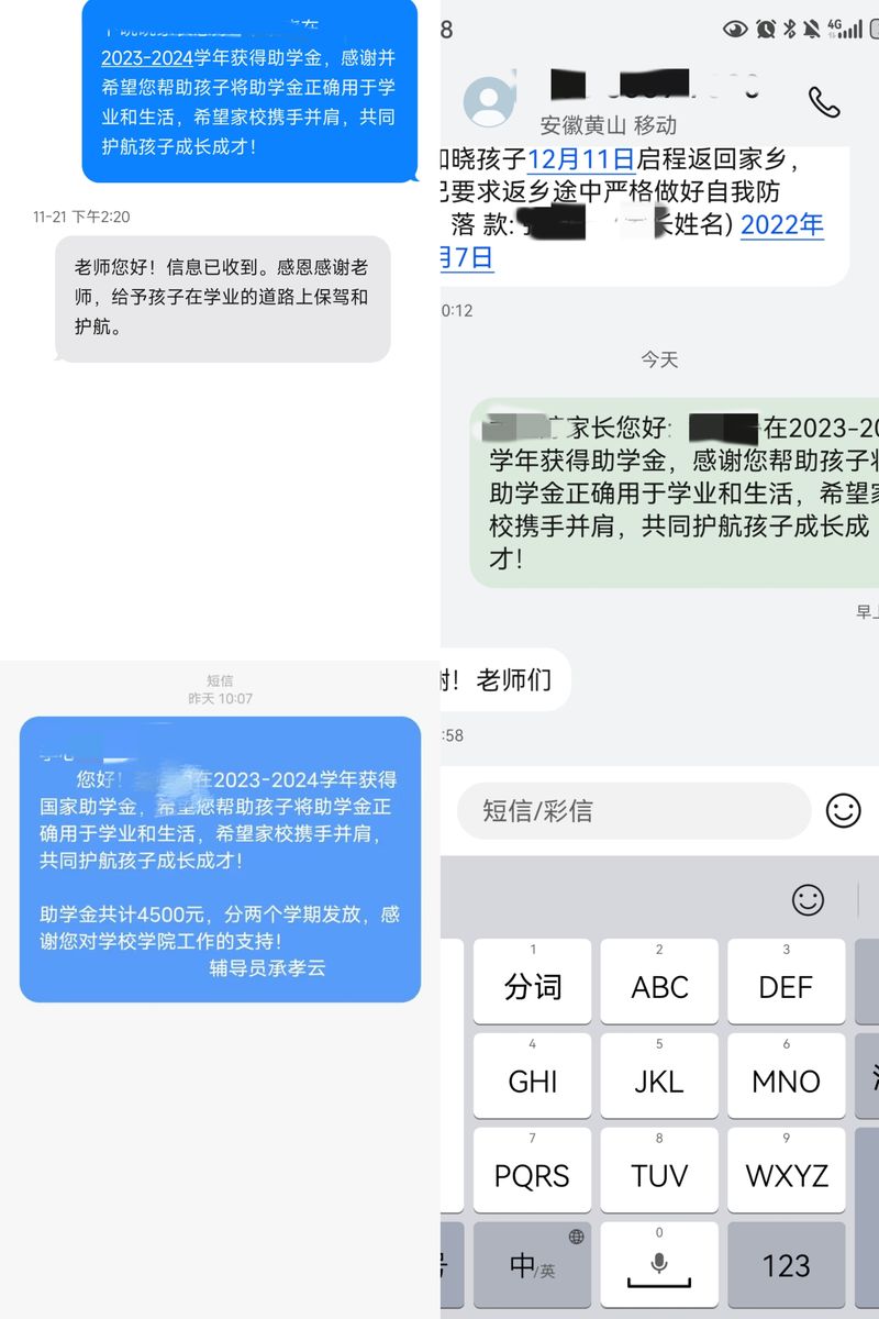 家校“信”育感恩情。为深入了解家庭经济困难学生实际情况,全面做好学生的精准帮扶工作,切实提升资助育人实效,提高资助政策知晓率和满意度,辅导员们通过电话、短信等方式逐一联系38名国家励志奖学金获得者学生家长。辅导员肯定了学生们在校优异表现,详细告知学生受资助情况,并希望家长可以协助学校指导学生在生活中正确使用奖助学金。辅导员们与家长沟通中希望家庭作为学生品德塑造的重要场所,家长要利用平时沟通注重感恩之情培养,让学生学会感恩父母、感恩学校、感恩国家。各位学生家长在通话中对学校的关心关怀纷纷表示感谢,一定配合学校做好学生教育引导工作。同时,辅导员通过短信与国家助学金获得者家长进行沟通交流。