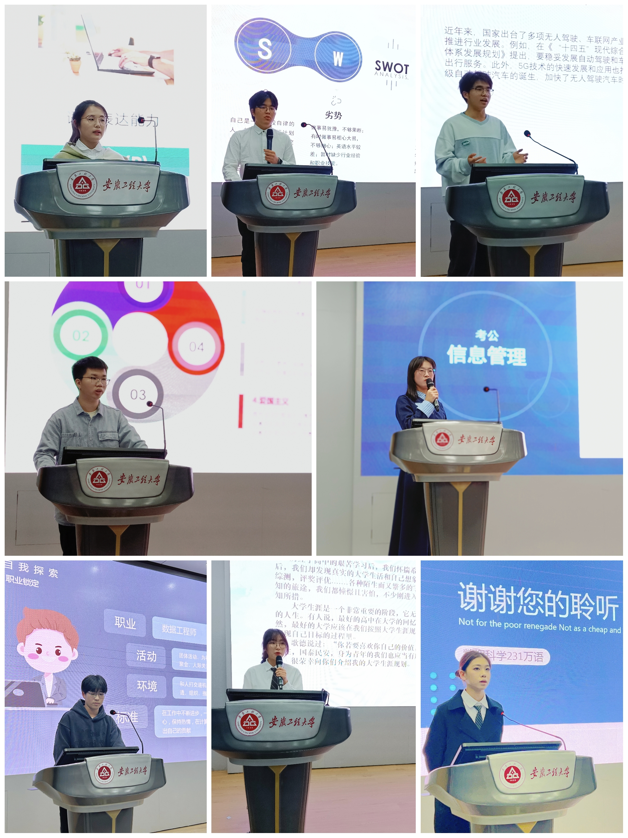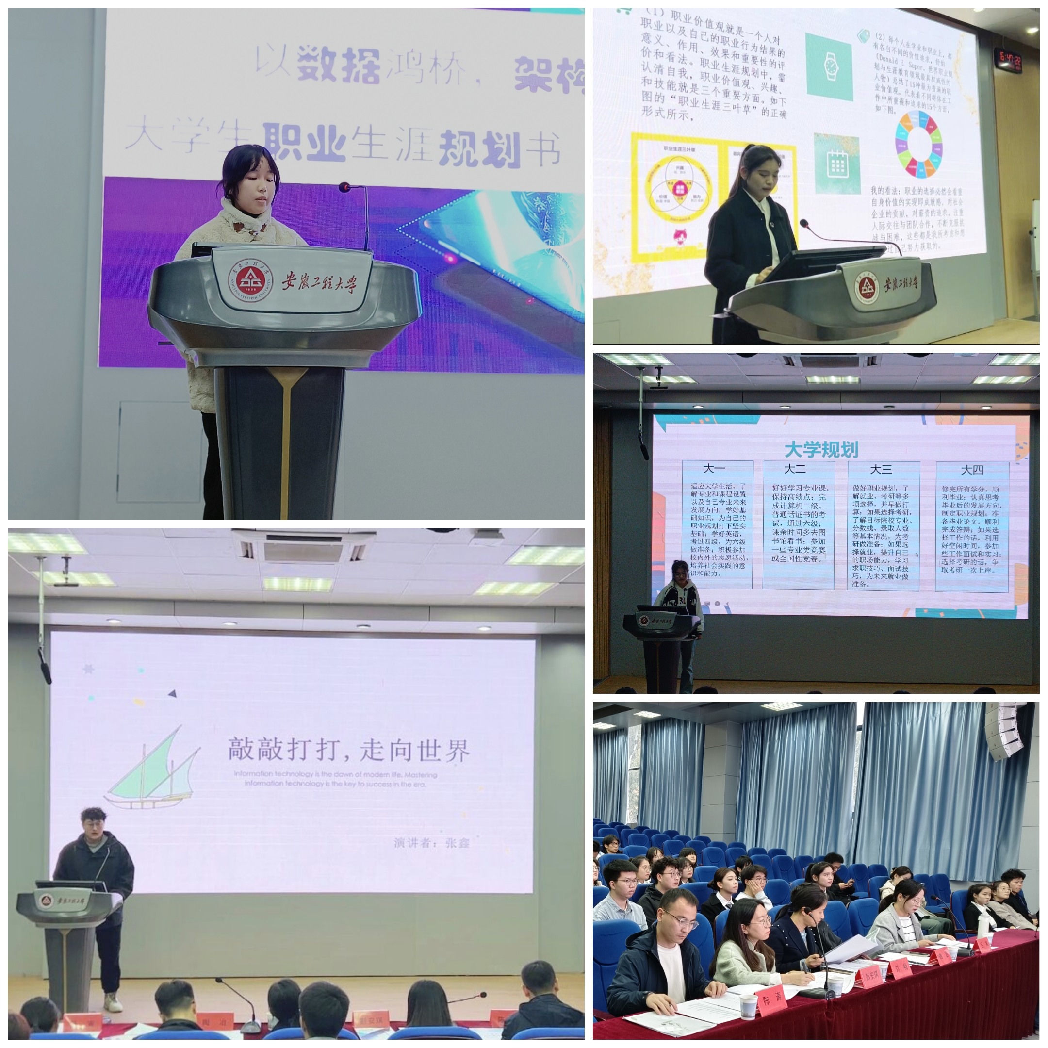 本次大赛的主题是“奋进新征程,筑梦启航行”,着重于在实践中探索自我,了解学科专业知识,做到知行合一,从而更加清晰明确的进行自我规划。经过初赛的选拔中,共有12名同学脱颖而出,进入决赛。决赛现场,通过“个人大学生涯规划PPT展示”和“评委提问”等环节。选手们通过对大学的感悟、自我的认知、目标的职业等内容为出发点,规划了每学期实现自我目标的具体措施和相关行动,介绍了对专业学习的认识和对未来职业的定位,展示了自己的大学计划和目标。通过运用MBTI测试、职业锚问卷、霍兰德职业兴趣测试等自我认知测评方法,结合自我感悟,将自身优缺点,所面临的机遇与挑战进行了深刻剖析,对自己未来的职业做了精准定位。在问答环节中,评委们针对专业认知、学业规划、职业准备等问题进行了提问,选手们根据问题现场作出回答,条理清晰,结论明确。获得本次大赛一等奖的软件234班方琪同学说,“备赛过程比获奖结果更为重要。通过参加这个比赛,我反复打磨了自己的生涯规划书,更清楚、更深刻地认识到自己未来发展的方向。”