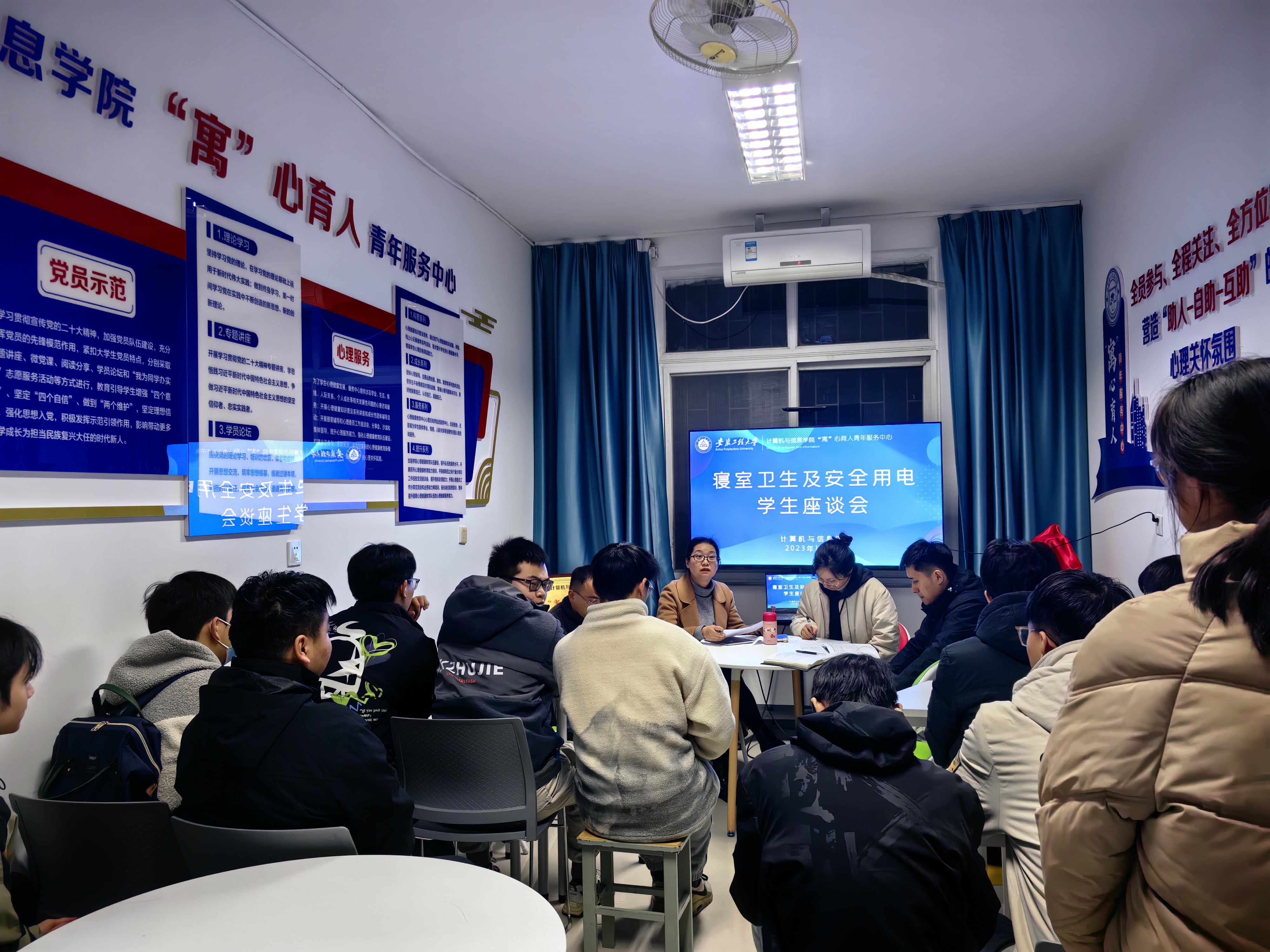 为进一步加强“一站式”学生社区建设,培养学生良好的寝室安全意识和卫生习惯,营造平安优美的生活学习环境,12月6日,计算机与信息学院在男生宿舍12栋102“寓”心育人青年服务中心开展以寝室安全警示教育为主题的学生座谈会。院党委副书记孙德茹、院团委书记、辅导员代表、寝室长代表和学生代表参会。
