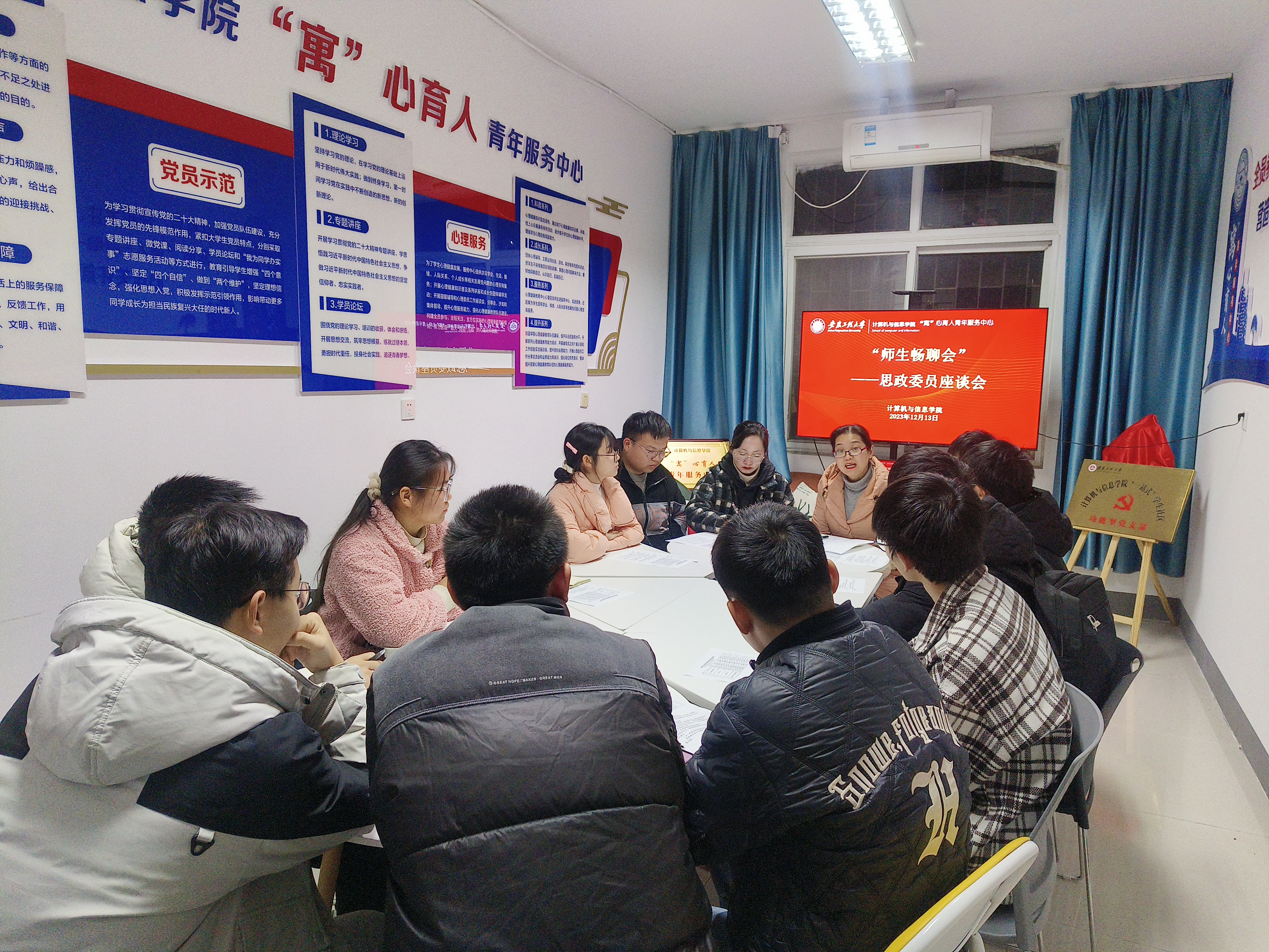 为进一步加强思政委员队伍建设,切实增强学生干部责任意识和服务意识,12月13日,计算机与信息学院在“寓”心育人青年服务中心开展“师生畅聊会”之思政委员座谈会,院党委副书记孙德茹、团委书记、各年级思政委员代表参加活动。座谈会由院团委书记吕寅主持。
