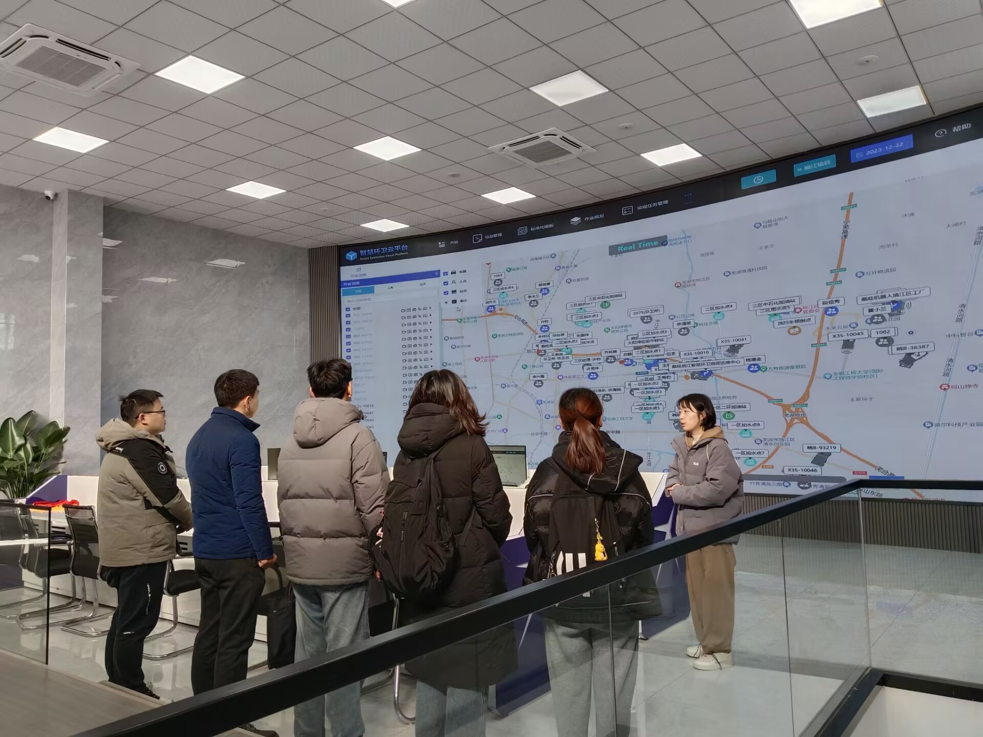 授牌仪式结束后,外国语学院师生一行5人参观了鸠江区智慧环卫网联中心。现场工作人员通过大屏幕演示的方式详细介绍了鸠江区智慧环卫云平台的功能。通过观看演示,同学们对云平台实现清扫车辆管理、环卫设施维护保养、环卫工人业绩考核、环卫作业指挥调度等功能有了更直观的了解。