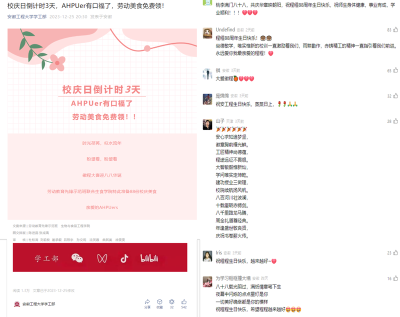 校庆宣传,提前“预热”。12月25日,RayBetApp官网下载 学工部发布的一条名为“校庆日倒计时3天,AHPUer有口福了,劳动美食免费领!”的推文引爆了朋友圈,精美的推文设计、新颖的活动形式、丰富的劳动美食吸引了广大师生转发,提前祝福母校生日快乐。截至目前阅读量已达1.3万,成为了校庆前夕的一道亮丽风景线。