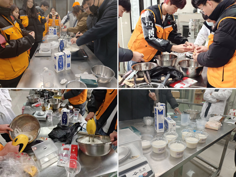劳动果实,制作“火热”。在生物与食品工程学院的指导下,劳动教育先锋示范班学员顺利完成原材料的采购、包装的设计等前期准备工作,分为两组制作校庆蛋糕、酸奶。食品212班王子豪同学指导学员熟悉制作酸奶、面包的方法和流程,以及食品专业相关知识。在动手操作过程中,学员们兴致勃勃,根据制作步骤、注意事项一步步将原料奶变为酸奶。从原料奶到酸奶的变化的几个小时内,经历配料、预热、均质、杀菌、冷却、接种、发酵、冷却等多个环节,每一个环节都需要学员高度集中。经过大家的努力,酸奶和蛋糕成功做出,学员相互品尝评价、彼此之间分享经验和喜悦。
