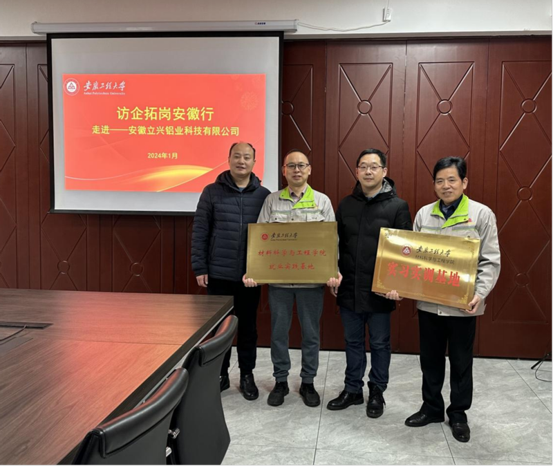 1月19日,学院一行走进芜湖市湾沚区安徽立兴铝业科技有限公司,与公司总经理朱健勇,行政副总兼党支部书记陶跃进洽谈人才培养和就业实训相关事宜。学院一行与企业签订了就业实践、实习实训协议,并举行授牌仪式。方玖胜、朱健勇共同为“材料科学与工程学院就业实践基地”揭牌;陶锋、陶跃进共同为“材料科学与工程学院实习实训基地”揭牌。