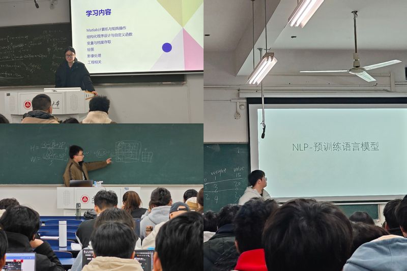 杨阳详细讲解了自然语言处理中的预训练模型,生动讲述ChatGPT如何与我们进行对话。方成从C++中“重载问题”出发,谈及如何利用CSDN、GitHub等计算机专业活跃社区自学,强调同学们要善于信息搜索,打破信息壁垒。杨玉斌讲解了深度学习中卷积神经网络的应用,解析了卷积神经网络的整体架构、卷积层的工作原理,让同学们对这一前沿技术有了更直观的认识。黄玉乐结合自身大学生创新创业项目分享了可重构计算系统芯片PE仿真设计与映射方法的研究,这一专题不仅拓宽了同学们的视野,也激发了他们对硬件设计的兴趣。陆佩玲分享了在MATLAB计算机应用方面的学习成果,特别是在矩阵操作和绘图技巧上的实战经验。张结婷从经典“0-1背包问题”出发讲述动态规划算法模型,讲述了自己在算法学习中的心得体会,给同学们上了一堂充满趣味的算法课。