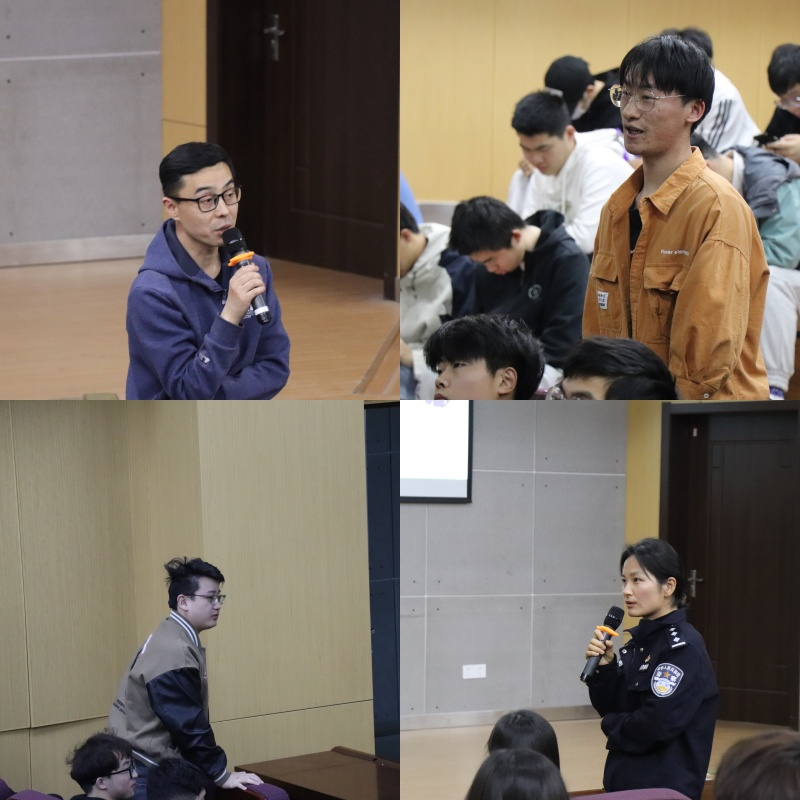 现场观众积极参与提问答疑阶段,围绕“大学生面对电诈诈骗应该注意哪些事项?大学生遇到电信诈骗应该怎么做,怎么有效预防?”等问题展开讨论交流,随后,城东派出所民警汪家丽、李有文,保卫处赵荣俊分别给予现场解答,并用鲜明生动的案例和令人瞠目的数字警醒大学生要时刻提高警惕,谨防诈骗。