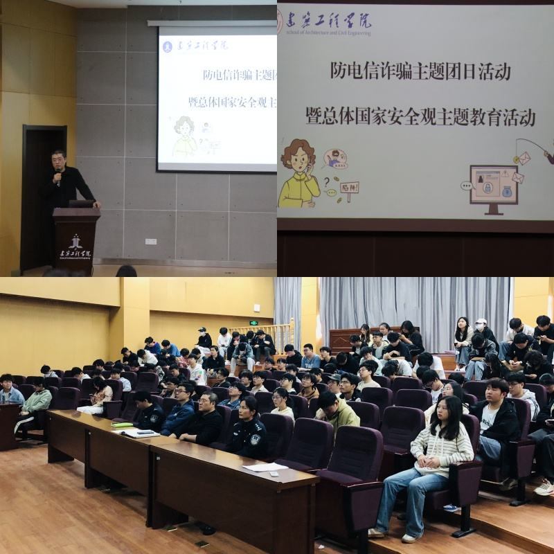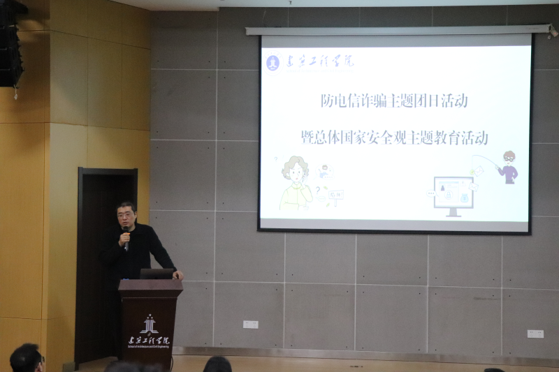 为进一步落实落细“三抓”工作教育,提升全体师生总体国家安全观教育,高质量开展防范电信诈骗活动。4月10日,建筑工程学院在C座3楼报告厅开展防电信诈骗主题团日活动暨总体国家安全观主题教育活动,城东派出所民警汪家丽、李有文,院党委副书记、纪委书记张礼波、保卫处赵荣俊、院团委负责人、辅导员及各年级各专业各班级全体寝室长参加活动。