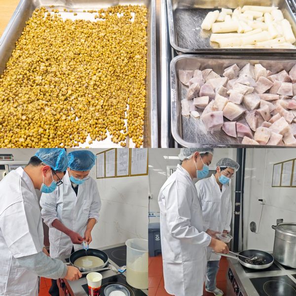 工作人员提前采购了糯米粉、紫薯、绿豆、山药、蓝莓等原料,选购了赋有吉祥寓意的糕点制作模具。在食堂的操作台,同学们与工作人员一起完成了果酱的熬制与馅料的炒制,清甜弥漫让人心旷神怡。同学们自行组队,开始制作,有的同学在准备和面、搅拌、揉面,有的同学把熬制的果酱和馅料分成小份备用,有的同学使出浑身解数开展包馅制作、倒模成型。大家做的热火朝天,慢慢的摸索出了每个制作过程的技巧,共同享受制作糕点的乐趣。