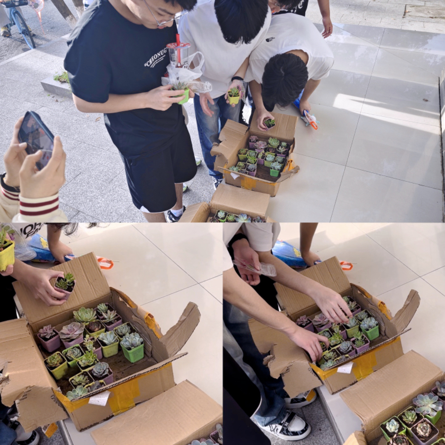 养护“多肉植物”是一个需要耐心的过程,从多肉的选择到日常对泥土的养护、光照强度的控制,都需要用心对待。“我想体验一下把植物慢慢养大的感觉。”物联网232的韦雯清同学是第一次参加绿植领养活动,“我们的心灵,也会在养护植物的过程中获得滋养,在生活中遇到的琐碎小事引起的烦恼,也可以在植物的陪伴下得到排解,获得力量”,她紧攥着手里的“多肉绿植”,对自己和领到的绿植许下期望——希望大学四年里,能够经受风雨磨砺,共同成长,“合抱之木,生于毫末,立志用功,如种树然”。