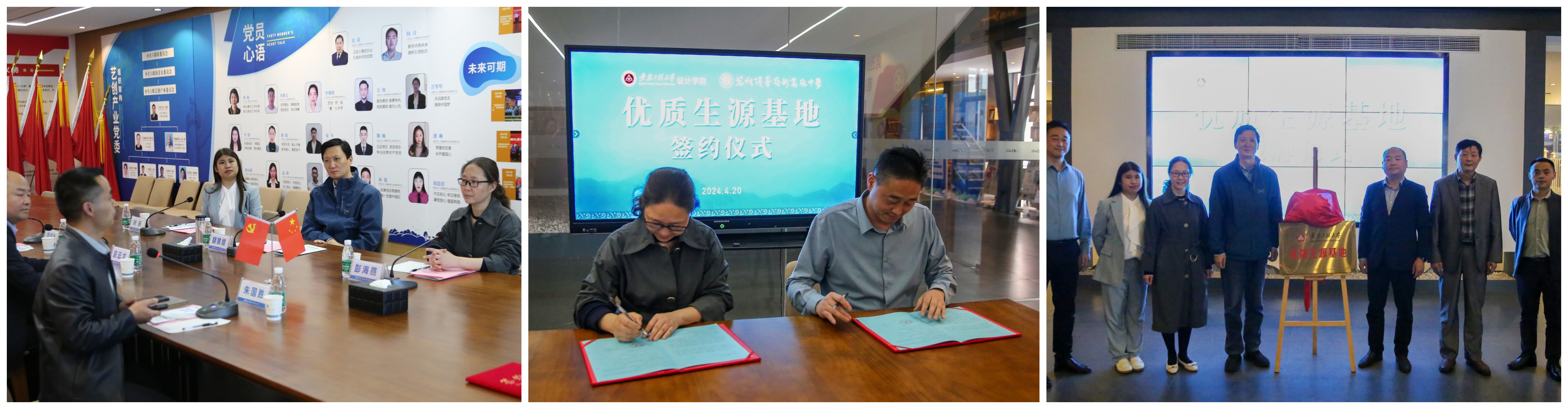 胡家增介绍了学校、学院的基本情况,对顶峰艺术高中每年向设计学院输送大量品学兼优的艺术类毕业生表示感谢,希望与学校进一步加深合作,扩大招生宣传力度。胡家增也热情邀请顶峰艺高组织学生来校参观校园和设计学院毕业设计展览,深入体验大学的学习和生活氛围。随后,彭海燕代表学校与查付平副校长签订了“优质生源地合作协议书”,胡家增和夏云龙共同为“RayBetApp官网下载 优秀生源基地”揭牌。相信在不久的将来,会有更多优秀的高中学子加入设计学院,共同书写艺术设计的辉煌篇章。