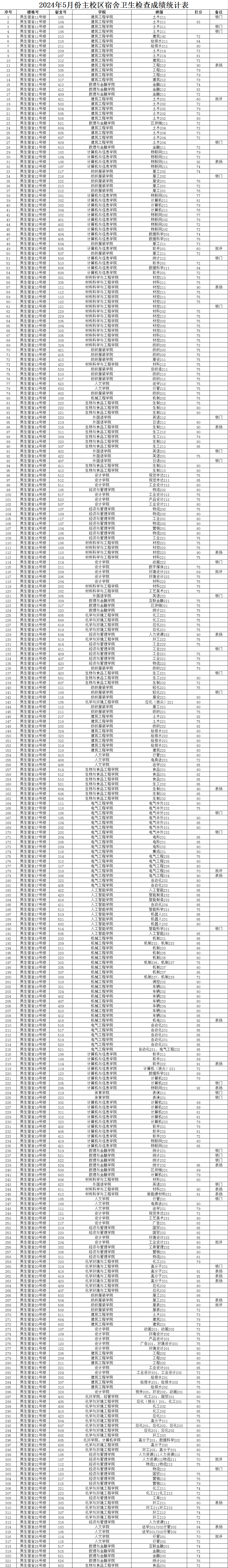 2024年5月份主校区宿舍卫生检查成绩统计表