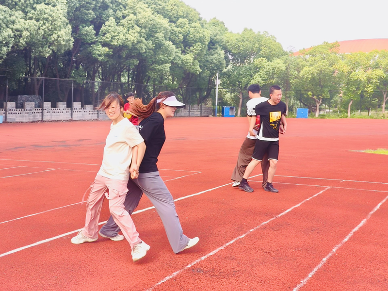 第一场比赛是四人五足。团队四人通过绑腿带绑在一起,一起冲向终点。比赛过程当中,同学们配合默契表现出色,各组齐头并进。