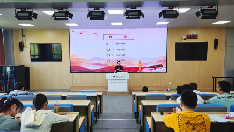 赵成靖详细解读了当前的征兵入伍政策。她从优待政策、入伍条件、应该流程、常见问题四个方面进行深入剖析讲解,使同学们对征兵入伍有更加清晰的认识。她鼓励动员符合条件、有志于投身国防事业的同学们积极报名,为祖国的强大贡献自己的力量。