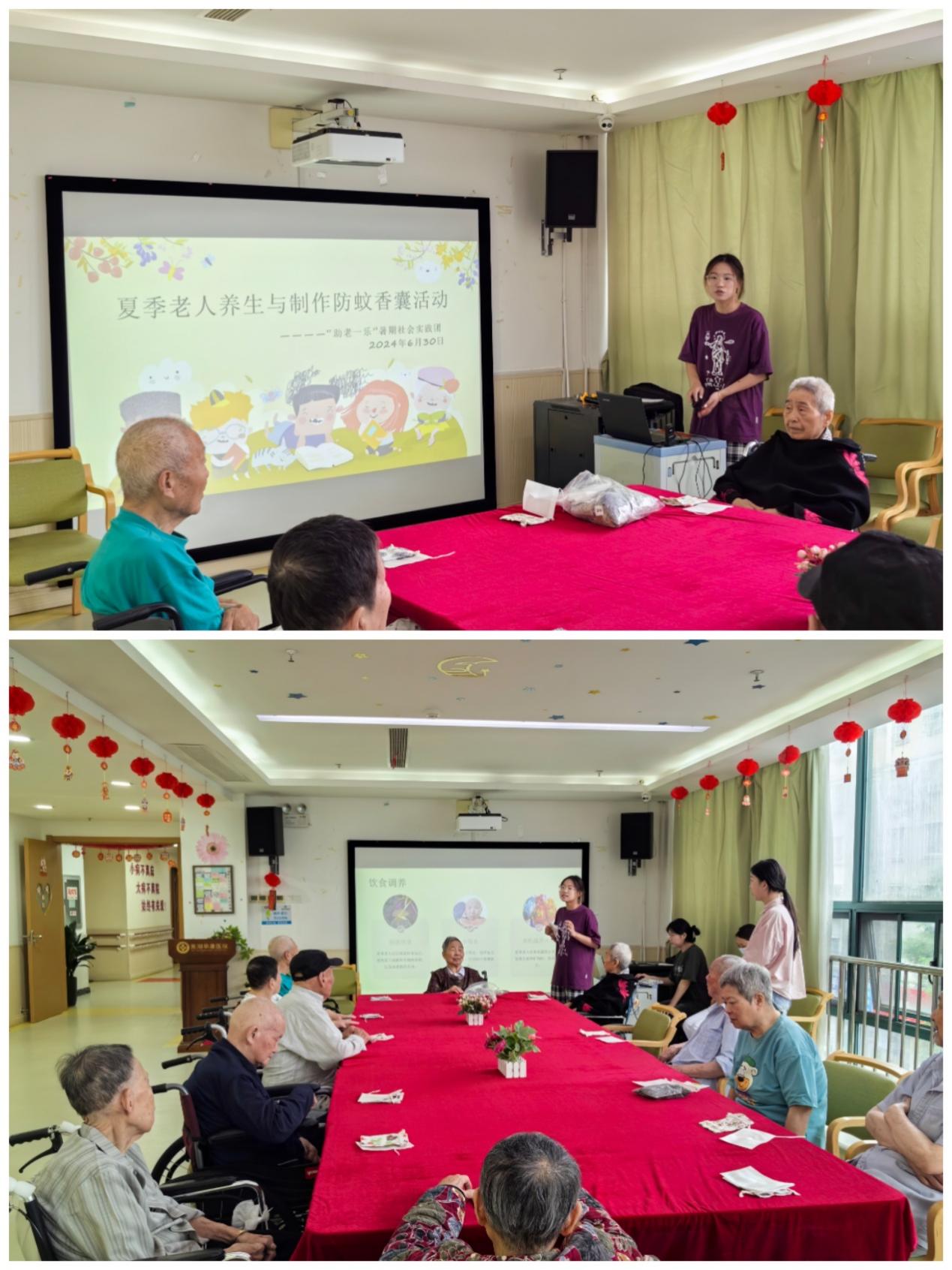 6月30日,团队在华康医院为老人带来一场夏季养生讲座和制作防蚊香囊的活动。实践团成员用通俗易懂的语言向老人们解释了夏季常见的健康问题和预防措施,还分享了夏季的食疗和运动建议。随后,成员们带领老人动手制作了防蚊香囊,这一活动不仅提高了老人的动手能力,也让他们了解到传统与现代结合的养生知识。
