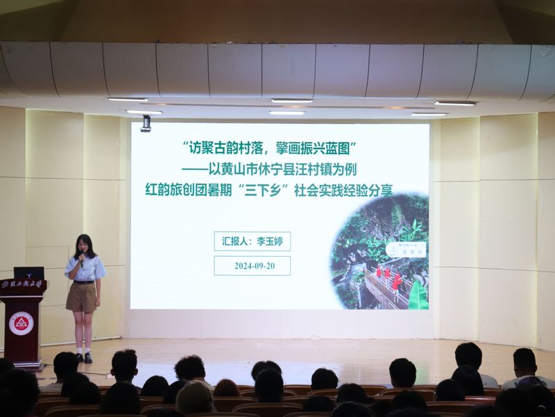 “桑萃小队”实践团队队长、研究生吴萱从项目概述、实践过程、成果展示和经验总结四个方面入手,讲述了深入岳西对当地生物质桑枝废弃物调研,挖掘桑枝新质生产力的可能性,以科技创新结合红色文化探寻岳西乡村振兴新方向的故事。“红韵旅创团”实践团队队长、食品231班的李玉婷汇报了团队在访聚古韵村落——黄山市休宁县汪村镇时发生的点点滴滴:调研探访全面了解当地农业产业现状、文化传承情况及村民生活状况,直播推广将汪村的古朴风貌、特色农产品以及丰富的民俗活动实时传递给外界。