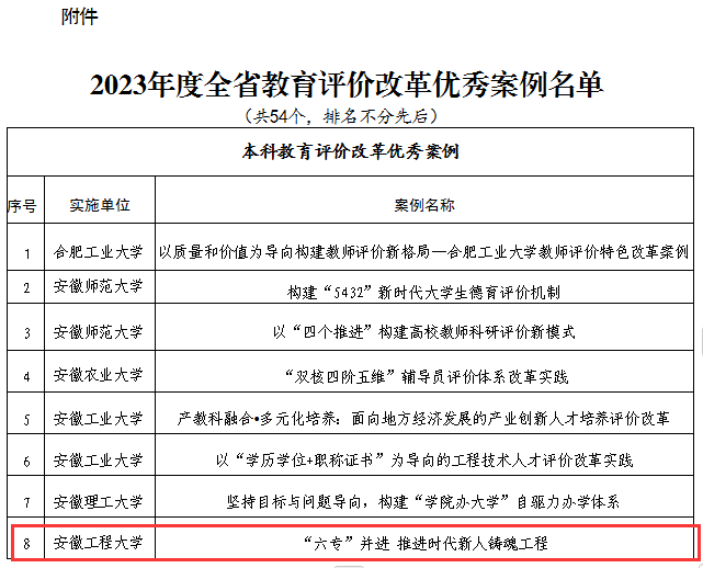 近日,安徽省教育厅公布了2023年度教育评价改革优秀案例评选结果,共评选出54个优秀案例,其中本科教育改革评价案例14个。我校报送的《“六专”并进 推进时代新人铸魂工程》入选。