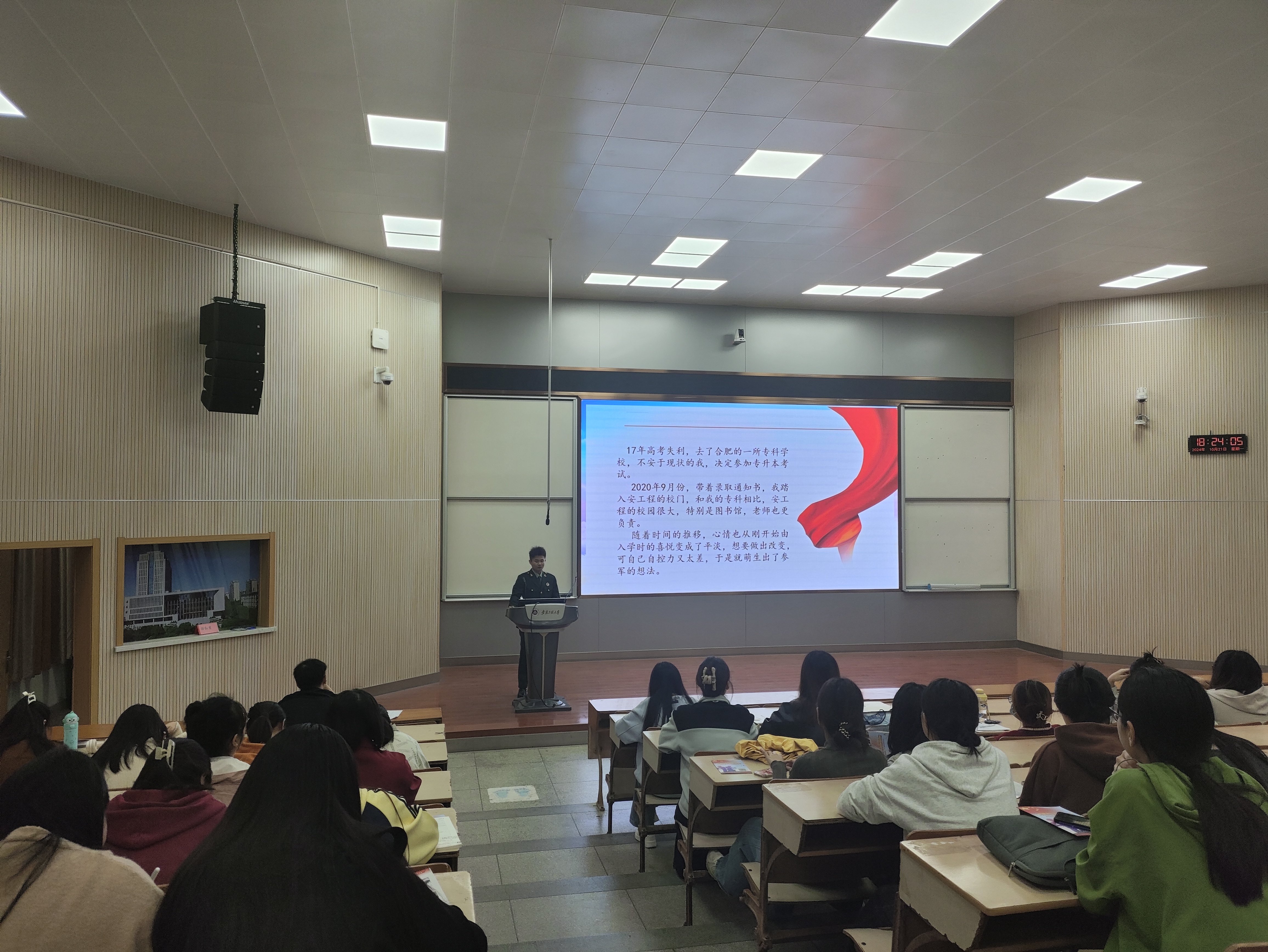 张欢景向大家作入伍经历分享,就自己的部队生活经历向大家描绘了一幅真切精彩的军中生活画卷,以自己的求学经历向同学们生动解读了大学生征兵入伍政策优惠。