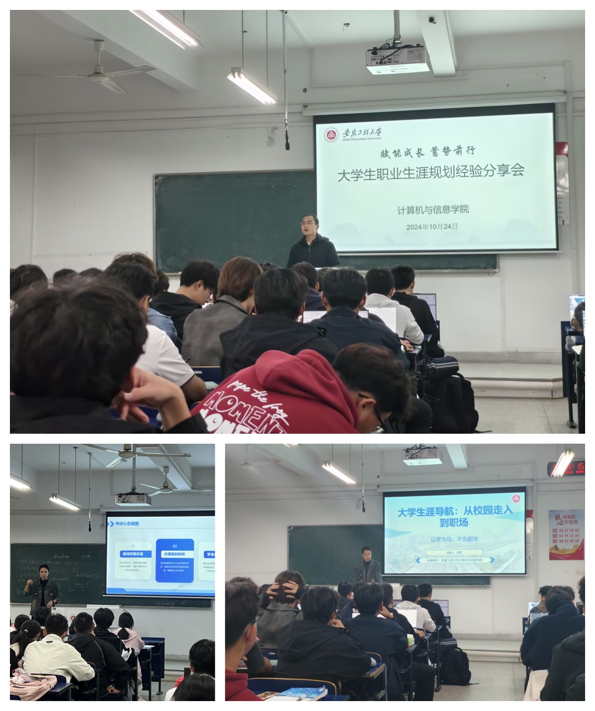 做好生涯规划,引导学生“职”面未来。为加强新生职业生涯规划教育,引导学生树立正确的职业生涯规划意识,更好地发挥自身潜能和价值,24级新生辅导员陈涛深入浅出地为新生们讲解职业生涯规划的重要性,帮助新生正确认识自我、了解职业世界,激发新生对于未来的思考和规划。兼职辅导员杨磊鼓励新生积极参加社会实践活动,积累社会经验,注重提升自己的综合素质,为实现自己的职业梦想奠定坚实的基础。本次职业生涯规划主题班会不仅是一个帮助同学们进行自我认知和职业探索的平台,也是一个提升新同学们职业规划能力、树立正确的就业观念、增强专业认同感、搭建交流平台的重要途径。