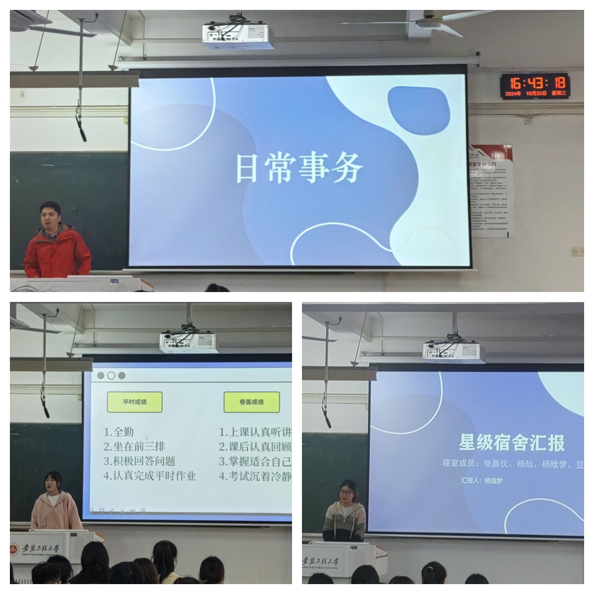 涵养优良学风,发挥朋辈榜样力量。班会中,各班级辅导员根据不同年级、不同专业的学生特点,重点围绕端正学习态度、掌握学习方法、明确学习目标和日常文明行为规范等方面展开指导教育,让同学们明确什么是优良学风,以及如何在日常学习中践行。辅导员承孝云邀请国奖获得者计算机(拔尖)221的张结婷、优秀星级宿舍的寝室长主动上台分享自己的学习和生活经历,充分发挥朋辈之间的榜样力量,激励同学们培养良好的学习习惯,养成较强的自律性和责任感。