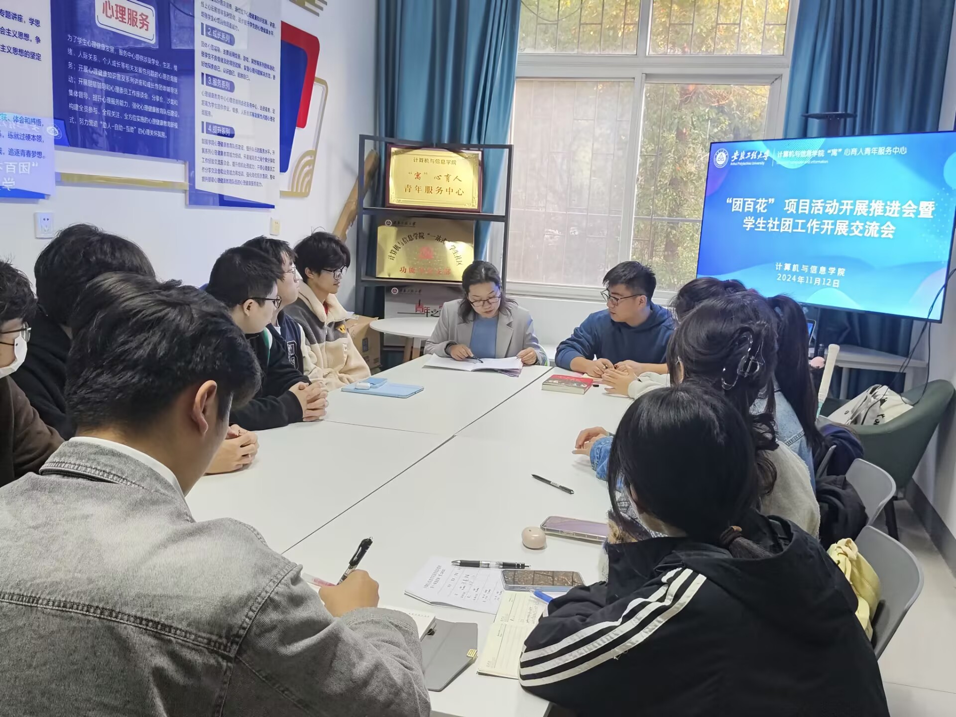 为深入学习贯彻习近平总书记关于青年工作的重要思想,切实加强学院学生社团建设管理,充分发挥学生社团育人功能,11月12日下午,计算机与信息学院在“寓”心育人青年服务中心学生社团交流座谈会暨“团百花”志愿服务项目推进会,学院党委副书记孙德茹、双创中心功能型党支部书记孙力力、学生社团主要负责人、学院团委理论学习中心组成员、“团百花”金银奖项目主要负责人参加活动。