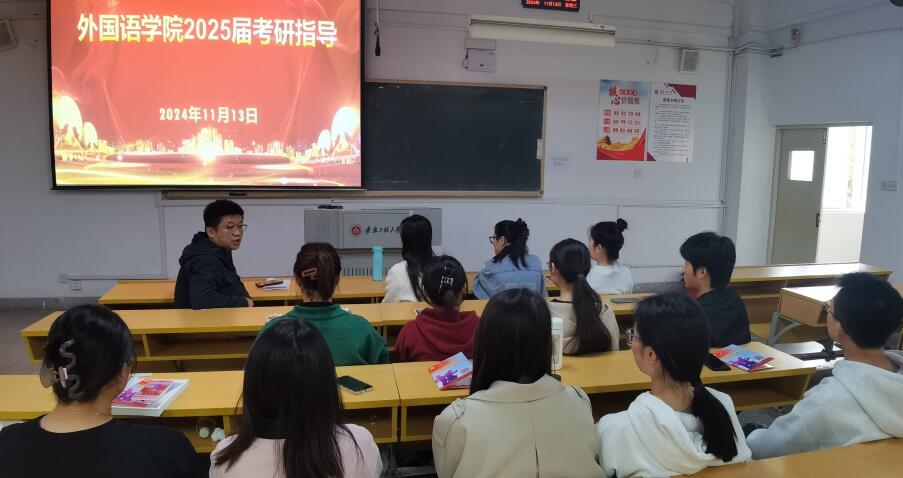 为帮助2025届毕业生更好规划未来,明确就业方向,11月13日,外国语学院在4教213举办“筑梦之路师长护航”考研指导暨征兵动员会。省级优秀教师、省级卓越教学新秀朱琪,省级教坛新秀苏涛,校武装部赵成婧应邀为学院2025届本科毕业生做专题指导。
