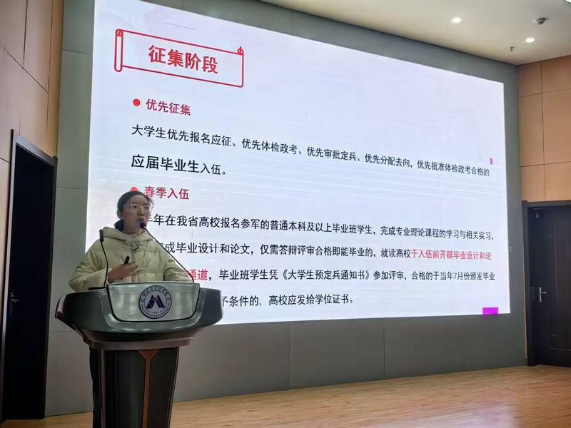 随后,赵成婧从优待政策、入伍条件、应征流程、常见问题等四个方面详细阐述了大学生征兵入伍政策,并向同学重点解读了服役期间的经济待遇、个人发展和退役后优待政策。同时,她回答了征兵过程中包括身体视力、个人征信、应届生身份、保留学籍和应征地选择等问题。赵成婧还与同学们进行深入互动,耐心细致地回答了大家提出的各类关切疑问,消除了同学们心中的顾虑和疑惑。她呼吁每一位同学都能积极行动起来,踊跃报名参军,加入到保家卫国的伟大行列中,共同为守护国家的安全和人民的幸福贡献自己的力量。徐博鼓励全体同学,要牢牢把握眼前的宝贵机会,积极响应国家的征召,踊跃报名,以实际行动报效祖国,鼓励同学们让青春在军营的熔炉中得到锤炼与升华。