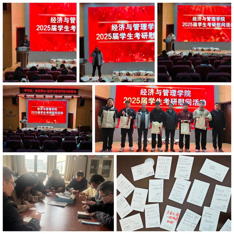 为帮助考研学子缓解备考压力,坚定考研信心,助力学生在最后的冲刺阶段保持最佳状态,12月5日,经济与管理学院在C座七楼报告厅举办了以“研途相伴,温暖助力”为主题的考研慰问会。经济与管理学院党委书记水心宝、院长龚本刚、副院长桂云苗、团委书记赵恒梅、毕业班辅导员徐博与2025届全体考研学生参与,本次慰问会由经济与管理学院党委副书记刘海涛主持。