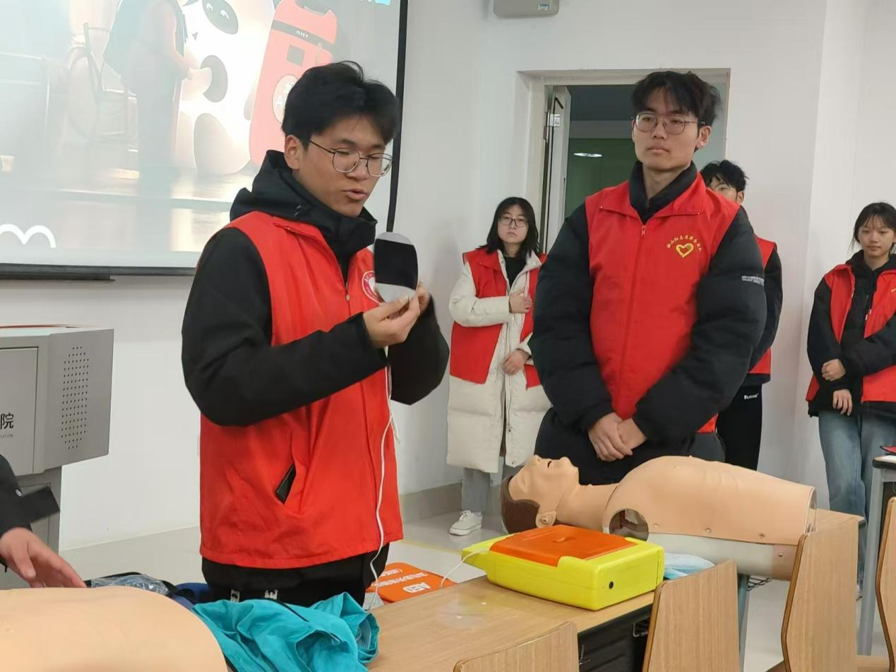 同学们分组进行实践操作,在模拟心搏骤停场景中,迅速反应,按照所学步骤争分夺秒地展开“救援”。参与的同学从最初的紧张生疏,逐渐变得沉稳熟练,在不断的练习中切实掌握了“AED”的使用技巧。期间,志愿者在旁耐心指导,及时纠正操作中的错误与偏差,确保每位同学都能精准把握要点。