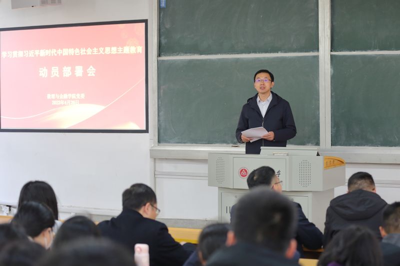 本网讯4月26日,数理与金融学院党委学习贯彻习近平新时代中国特色社会主义思想主题教育动员部署会在2J107召开。会议由学院党委副书记、院长吴小太主持,学院师生党员参加了会议。
