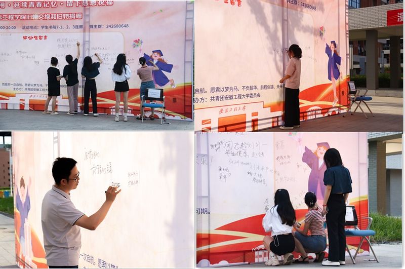 在7-1学生书院前呈现着一张椅子、几支水笔和一张大型的留名墙,毕业生们纷纷在上面留下他们的青春印记并作合影留念,无言的字诉说着他们心中的情感。同时也对低年级学弟学妹们表示衷心的祝愿,希望大家能早日确定人生目标,努力拼搏,不负青春、不负韶华。