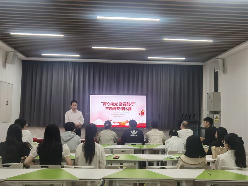 本网讯为深入开展学习贯彻习近平新时代中国特色社会主义思想主题教育,凝聚广大师生党员在奋进中国式现代化赶考路上的磅礴力量,突出“三抓”工作要求,践行“三全六专”育人理念,推动主题教育走深走心走实。5月25日,化环学院在学院一楼学生能力发展中心举办“青心向党 奋发前行”主题教育微党课比赛。学院党委书记章兵出席,各学生党支部书记担任评委,各学生党支部党员代表参加了本次比赛。