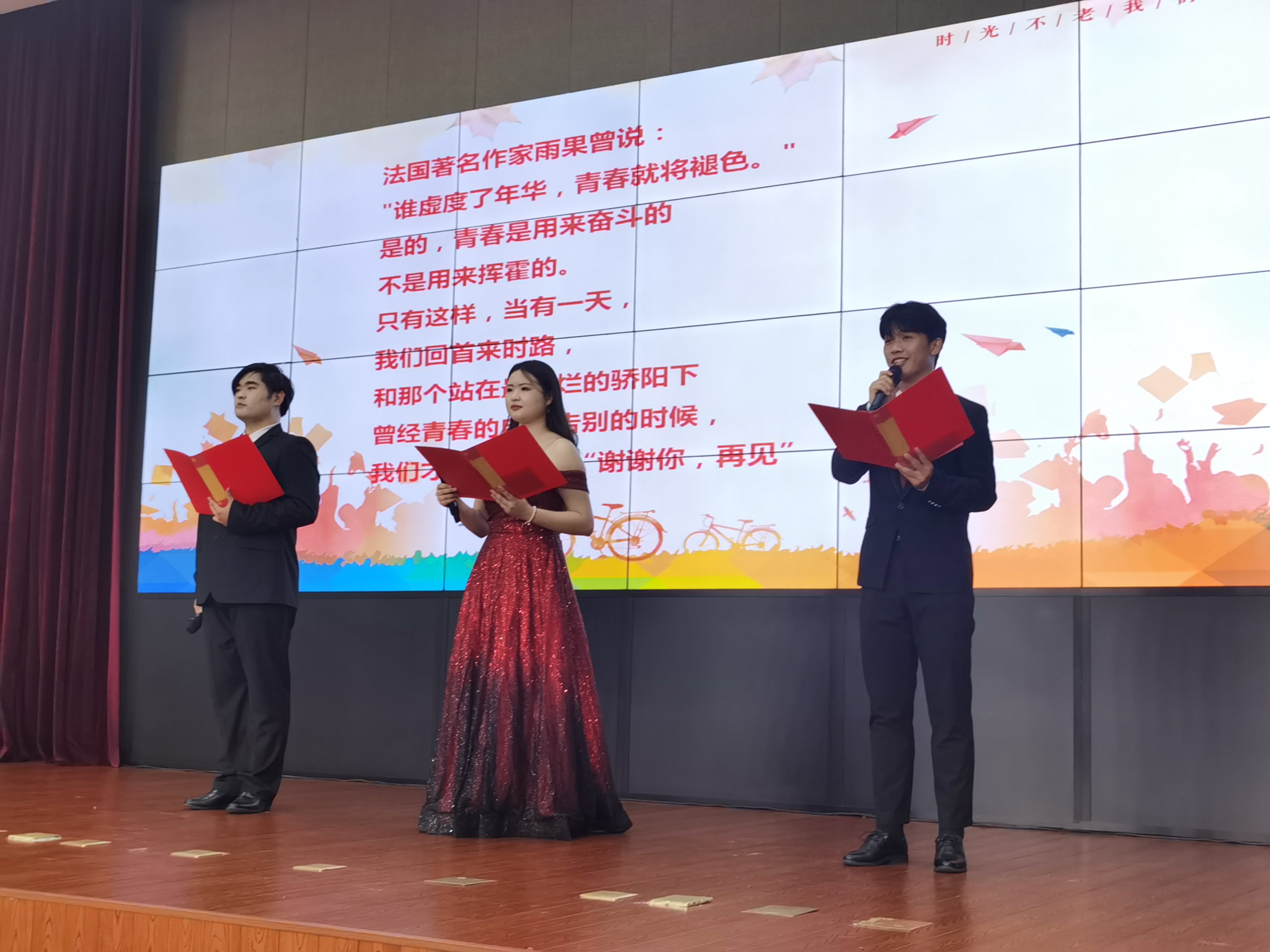 教师代表刘云云、李晓光、韩利敏带领全体毕业生重温习近平总书记关于青年工作的重要论述,号召广大青年自觉把个人命运与国家发展紧密结合,在建设社会主义现代化国家的火热实践中绽放青春之花。学生代表周斐然、王超、王焱用中英文朗诵诗歌《青春》,将李大钊、汪国真、塞缪尔·厄尔曼、雨果对青春的理解一一呈现,向毕业生发出“用青春奋斗书写人生华章”的邀约。