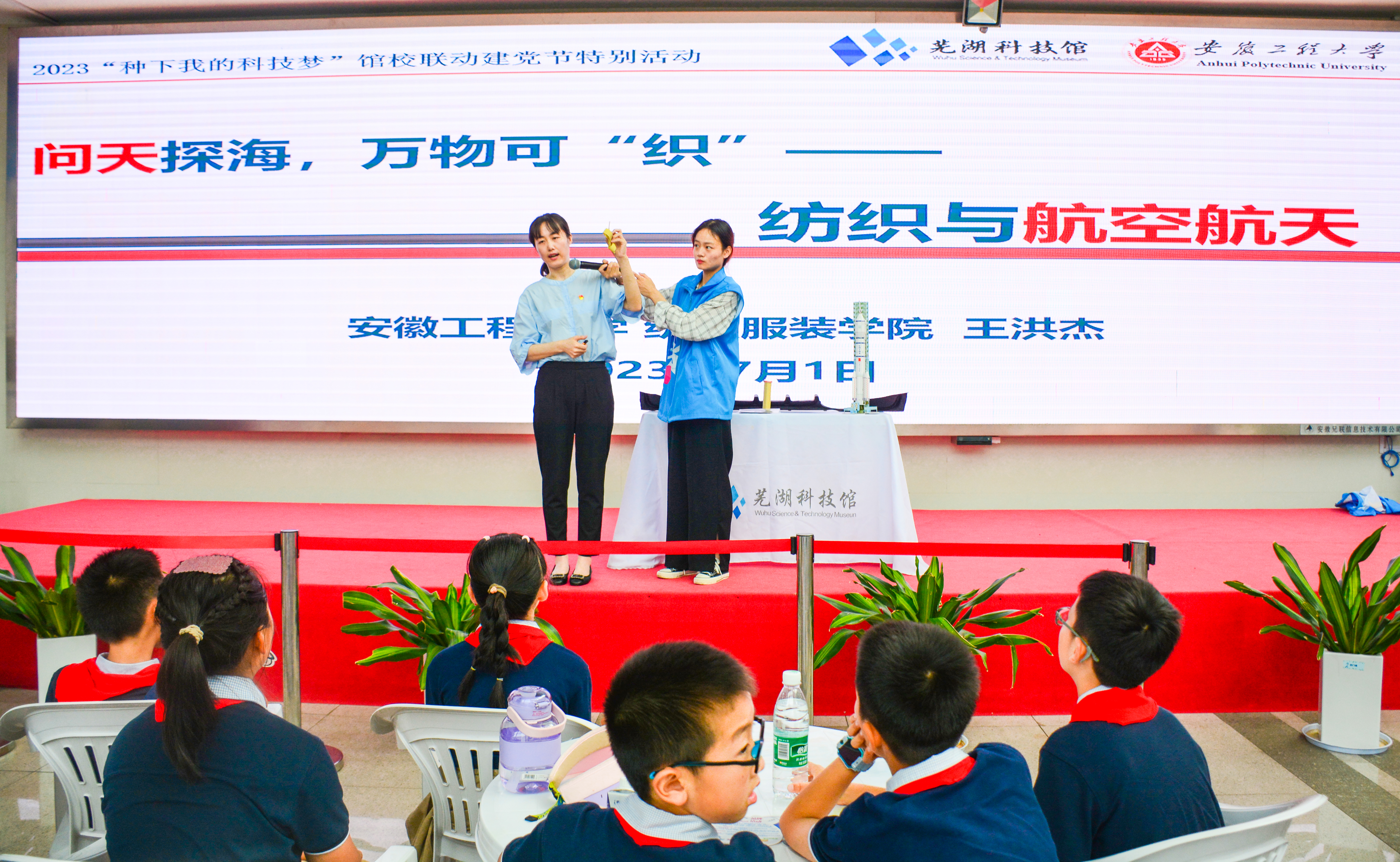 本网讯7月1日,纺织服装学院“行走的课程思政”公益团队赴芜湖科技馆开展“花开新时代 童心永向党”七一建党节主题科普活动。学院纺织专业教师王洪杰老师将纺织科技与航空航天相结合,将思政元素融入科普知识,为青少年开展了一次充满纺织黑科技的航空航天科普活动。
