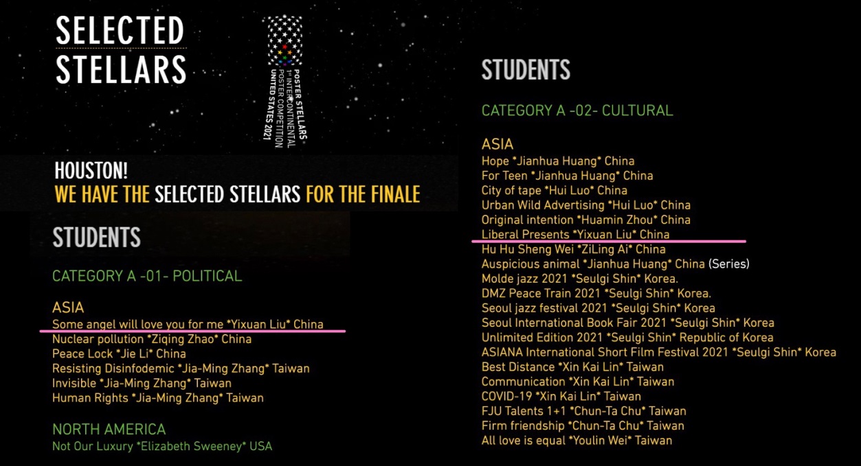 本网讯近日,由艺术学院史启新老师指导的研究生刘艺璇的两幅海报作品《Some angel will love you for me》《Liberal Presents》入选美国2021第一届洲际海报大赛(Poster Stellars)。