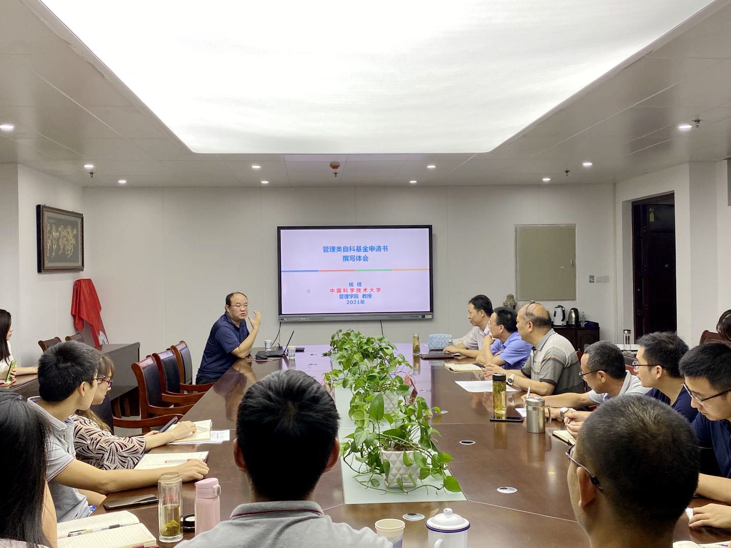 杨锋和师生们分享了“管理类国家自然科学基金申报书撰写体会”,他主要从国家自然基金选题、写作技巧、申报注意事项以及会议评审规则等方面展开,并重点强调了做好2022年自然科学基金申报书撰写预备功课的重要性,提早准备申报书撰写是后期多轮次修改和细节打磨的关键,并分享了自然科学基金申报书类别选择、关键词提炼等细节的撰写经验。