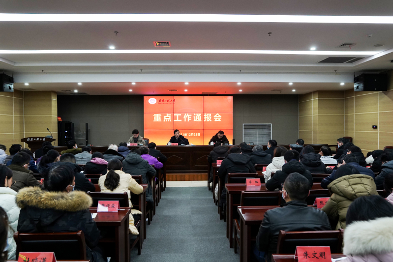 本网讯 12月28日下午,学校在图书综合楼202会议室召开2021年度第二次重点工作通报会。校党委书记刘宁,校党委常委、副校长郑健,相关职能部门负责人,各学院、各部门教职工代表、离退休老同志代表和学生代表参加会议。会议由校工会副主席张寅红主持。