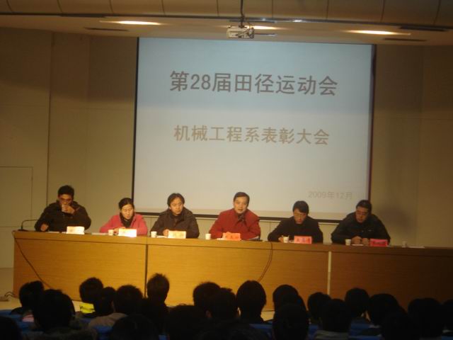 机械工程系运动员代表队在校第28届田径运动会上取得甲组第一、乙组第一、总分第一的优异成绩,为表彰我系健儿的奋勇拼搏和广大同学的团结、奉献精神,机械工程系于12月3日下午4:30在学术报告厅隆重举行校第28届运动会表彰大会。系党总支副书记邓英扣,团总支书记黄炜,系辅导员王彦青、董芬、张礼波及
