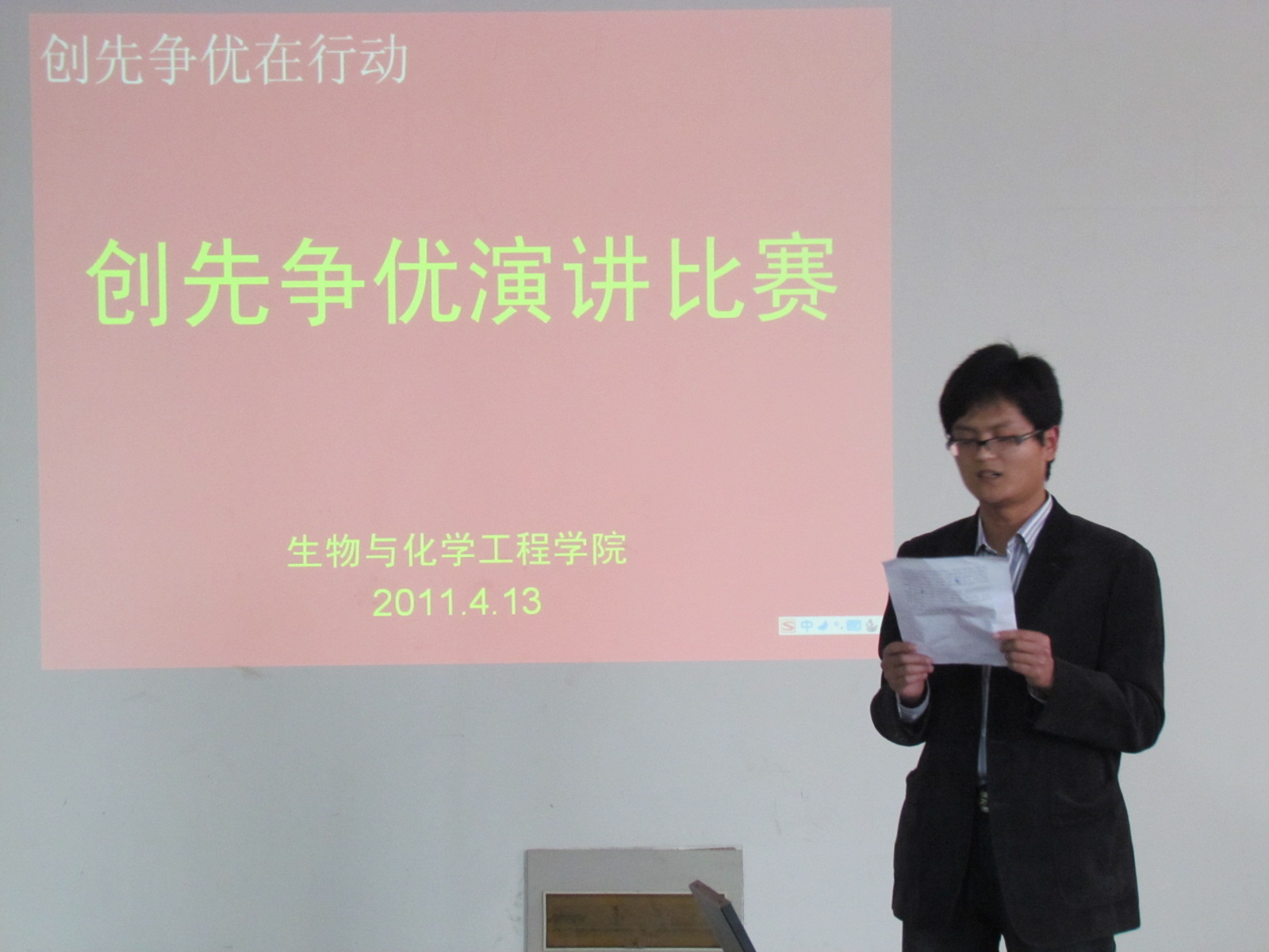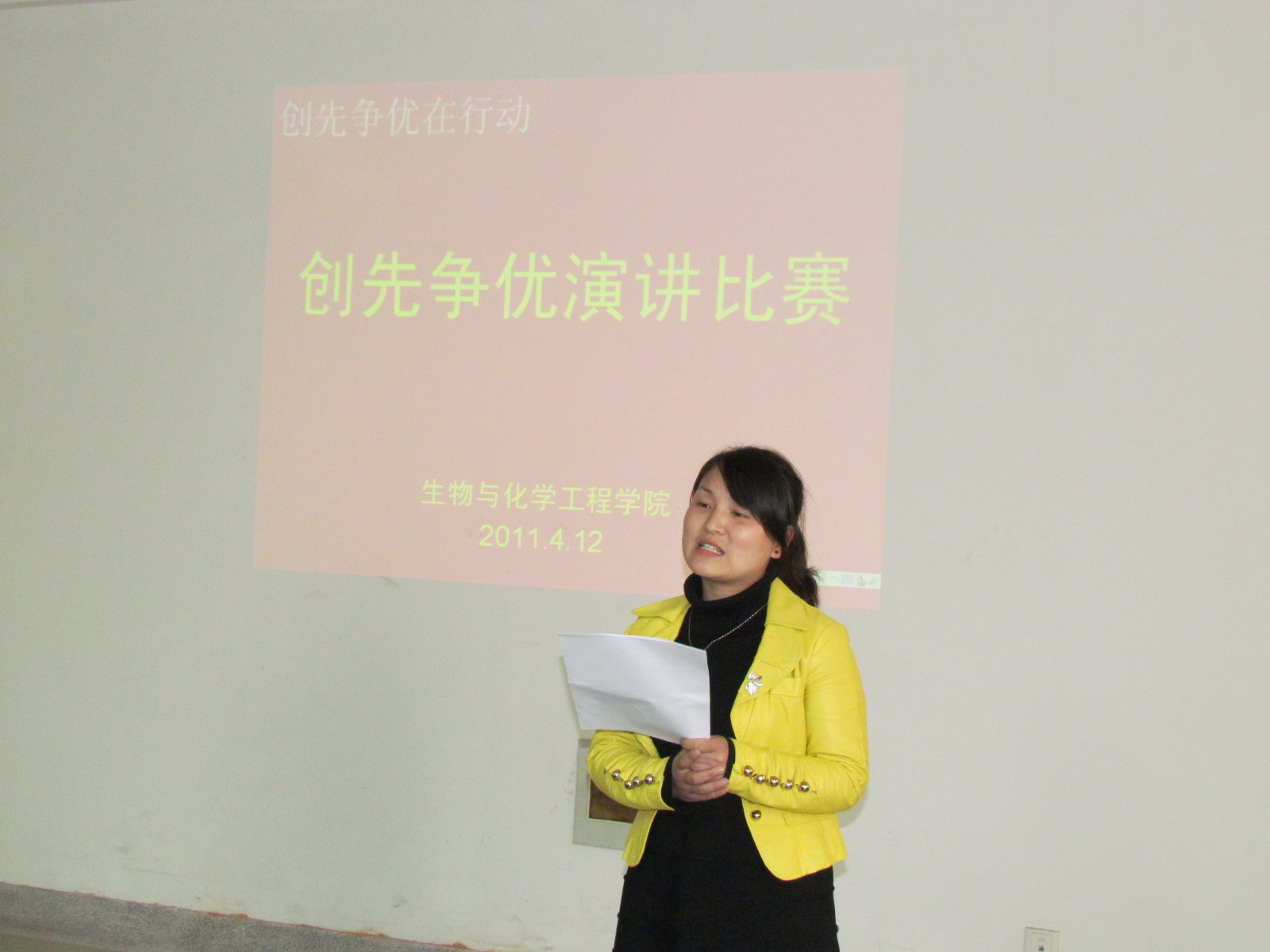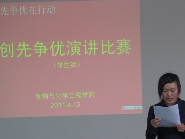 按照《关于开展我校“创先争优在行动”主题征文演讲比赛》的通知要求,生化学院党委高度重视,召开专题会议布置,广泛宣传,积极动员各学生支部党员参加征文演讲比赛,使参加征文演讲比赛的过程成为党员提升创先争优意识的教育过程。经过各支部认真准备,共推选6名教工党员、18名学生党员参加学院“创先争优在行动”主题征文演讲比赛。选手们的演讲非常精彩,经过评委评选出名次奖项后,学院领导为获奖选手颁发了奖品。最后学院又分别推荐2名教师党员和1名学生党员参加学校的比赛。
