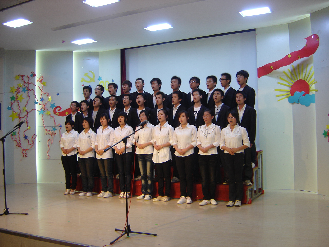 大赛在一片热烈的掌声中拉开帷幕。首先是比赛第一环节——学生各党支部合唱环节:各党支部党员按顺序进场,他们着装整齐、气宇轩昂、声音洪亮、配合默契,鼓舞人心的《走进新时代》,饱含深情的《祖国不会忘记》,高亢而又悠扬的《山丹丹开花红艳艳》,激动人心的《歌唱祖国》,气势宏大的《咱们工人有力量》,慷慨激昂,意气风发的《我们走在大路上》,一曲曲唱出了红歌的雄浑气势和催人奋进的精神。随后是大赛的第二环节——各党支部党员代表的独唱环节。节奏明快的《小白杨》、悠扬的《草原上升起不落的太阳》、振奋人心的《红旗飘飘》等红歌赢得了在场所有观众的喝彩声。接着,教工第三党支部奚琳老师独唱《军港之夜》和教工第一、二党支部带来的合唱《我和我的祖国》、《唱支山歌给党听》,将比赛的气氛推向高潮。之后,马健老师为本次大赛作点评,他高度赞扬了同学们的精神风貌和演唱效果,同时也提出一些不足之处。最后,由颁奖嘉宾对获奖支部进行现场颁奖。