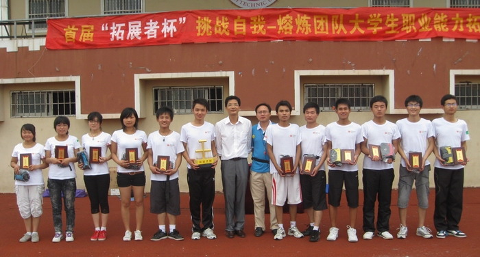 参加此次拓展大赛的12个学院各有一支代表队,共144位同学。大赛分六场进行,每场淘汰两队,持续四天。比赛以拓展训练课程形式考验了参赛选手们的目标力、协作力、坚持力、合作力、执行力、领导力等六项职业能力。在每队选出队长、队秘,并进行队名、队歌、队旗等团队文化建设后比赛正式开始。在第三场比赛“不倒森林”中选手们以坚持不懈的努力,阐述了要正确面对失败、敢于挑战困难的生活哲理;第四场“命悬一线”中他们以高昂的姿态体现了个人决定团队命运的定理;最后一场“挑战150”中选手们有条不紊的表现,充分展现了团队沟通和协作的重要性。在活动中选手们积极参与,并对如何开拓自己、如何进行协作进行了深度的思考与讨论。最终,经过激烈的角逐机械与汽车工程学院代表队以其优异的表现夺得本次比赛的冠军——精英团队奖。最后,体育学院党总支文才新书记为获奖代表队颁发了奖杯和证书。
