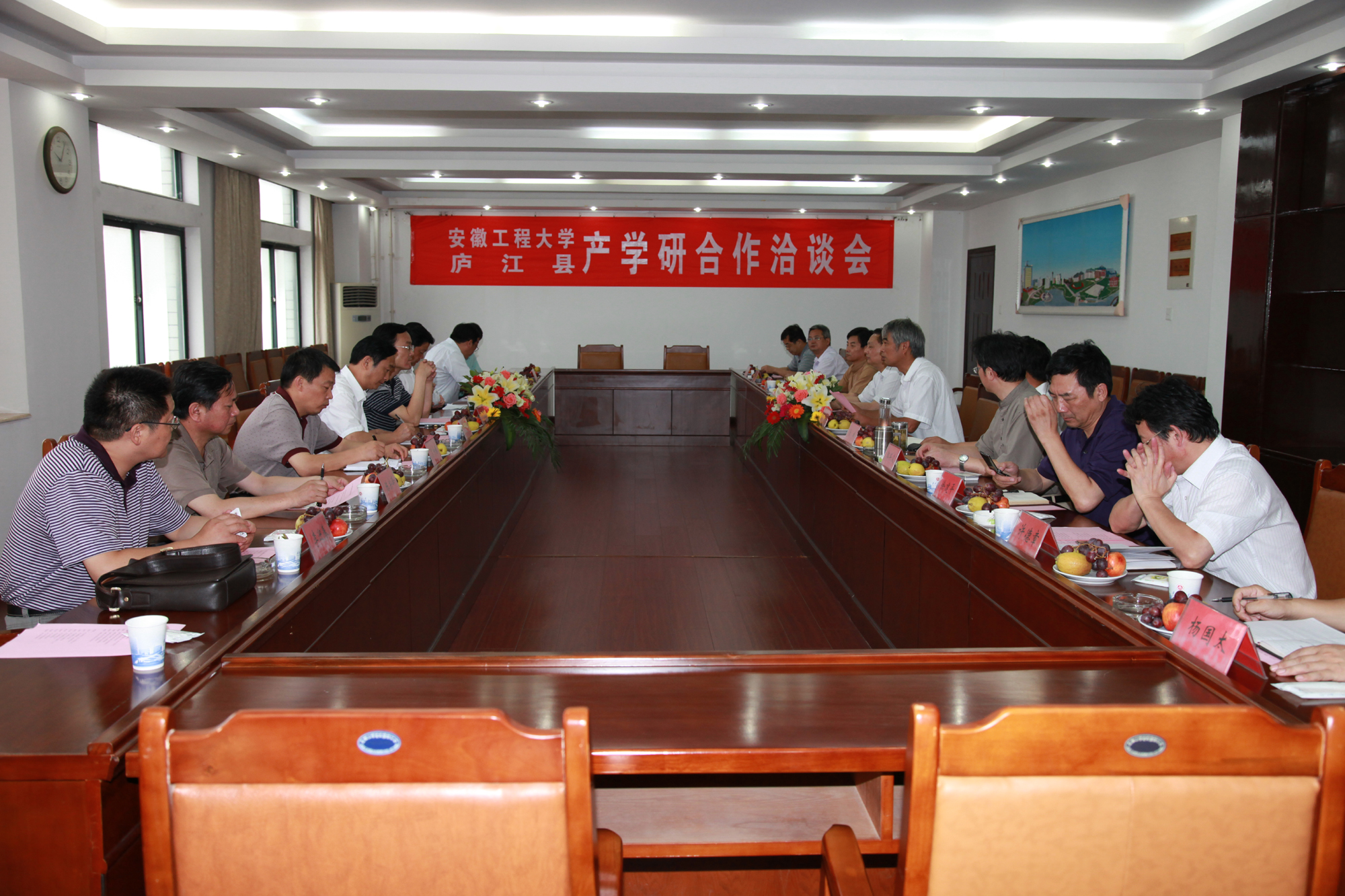 陈其工对庐江县代表团的到来表示欢迎,并表示学校将全力支持和推进与庐江县的全面产学研合作,有条件要合作,没有条件创造条件,也要合作。干洪指出,庐江县“三大基地”、“八大产业”的发展规划,其中绝大部分产业与我校的专业设置关联度很高,希望双方围绕这些领域开展全面科技合作。汤斌简要介绍了学校的基本概况,对双方如何开展产学研合作提出了具体的设想。汪奇燕也对客人们的到来表示欢迎。