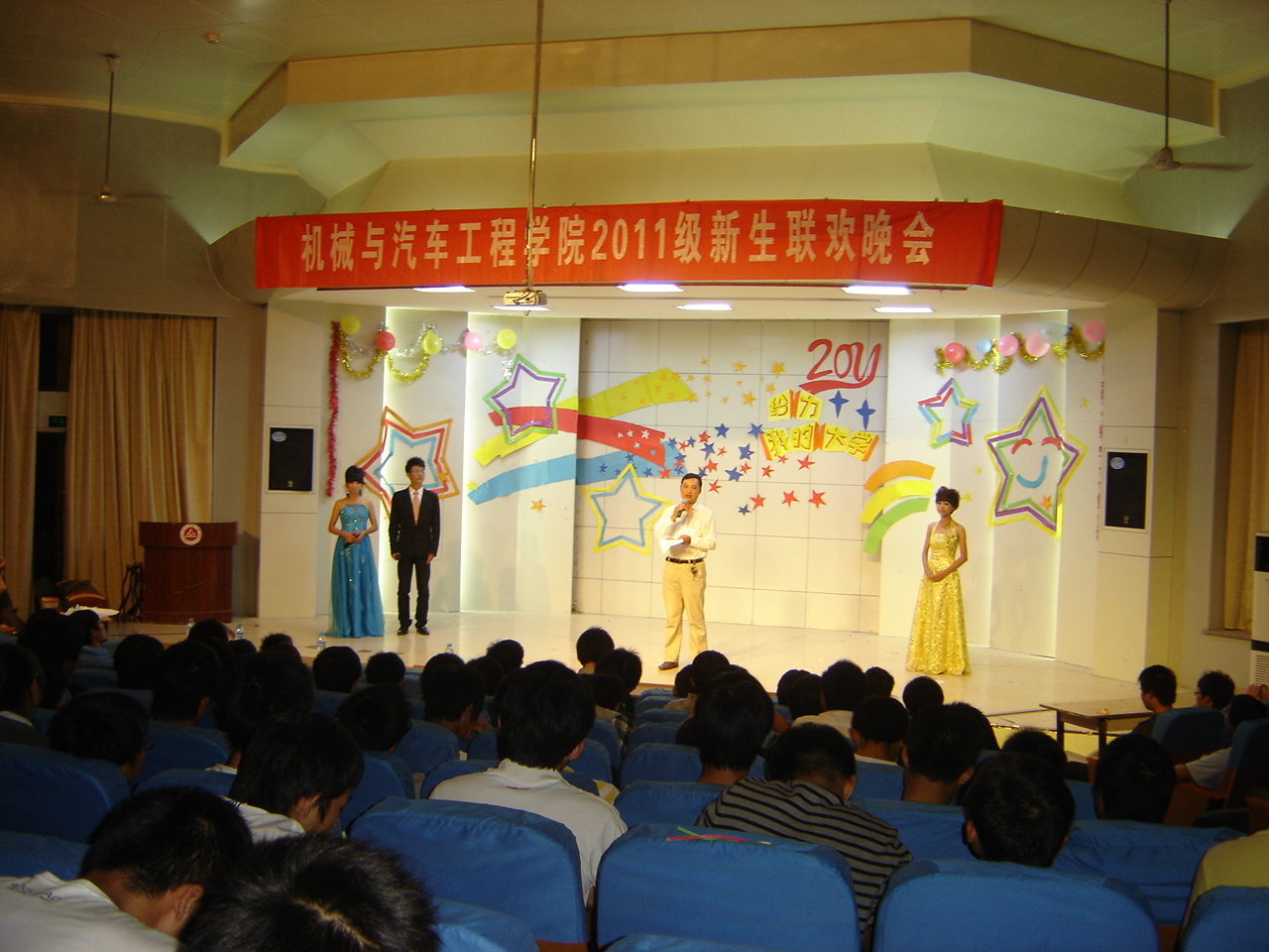 为欢迎2011级新同学,帮助他们更快、更好地适应大学生活,给他们一个展现自我的舞台,机械与汽车工程学院于9月24日晚上7点在学术报告厅举行了2011级迎新生晚会。院党委书记邓英扣、团委书记黄炜,2011级辅导员陈刚和孙霞老师出席晚会,全体新生参加了晚会。